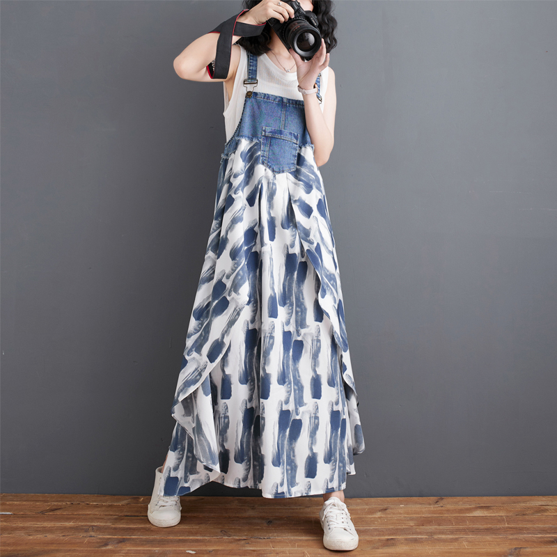 韓版時尚設計感牛仔拼接雪紡背帶連身裙