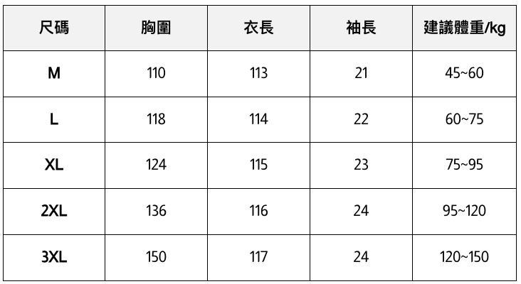 此處給出的參考尺寸表只是一個標準指南