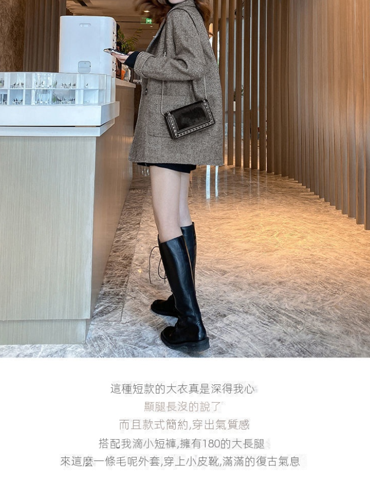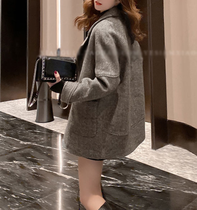 大碼時尚韓系顯瘦復古格紋拼接毛呢外套
