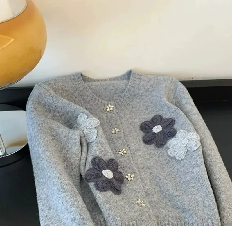 韓版花朵寬鬆毛衣外套慵懶刺繡針織開衫