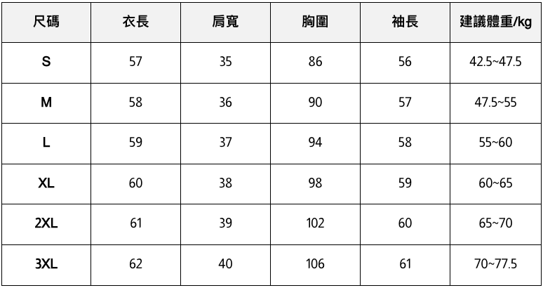 此處給出的參考尺寸表只是一個標準指南