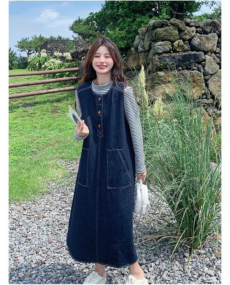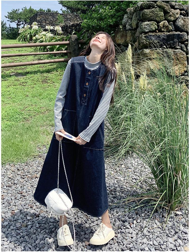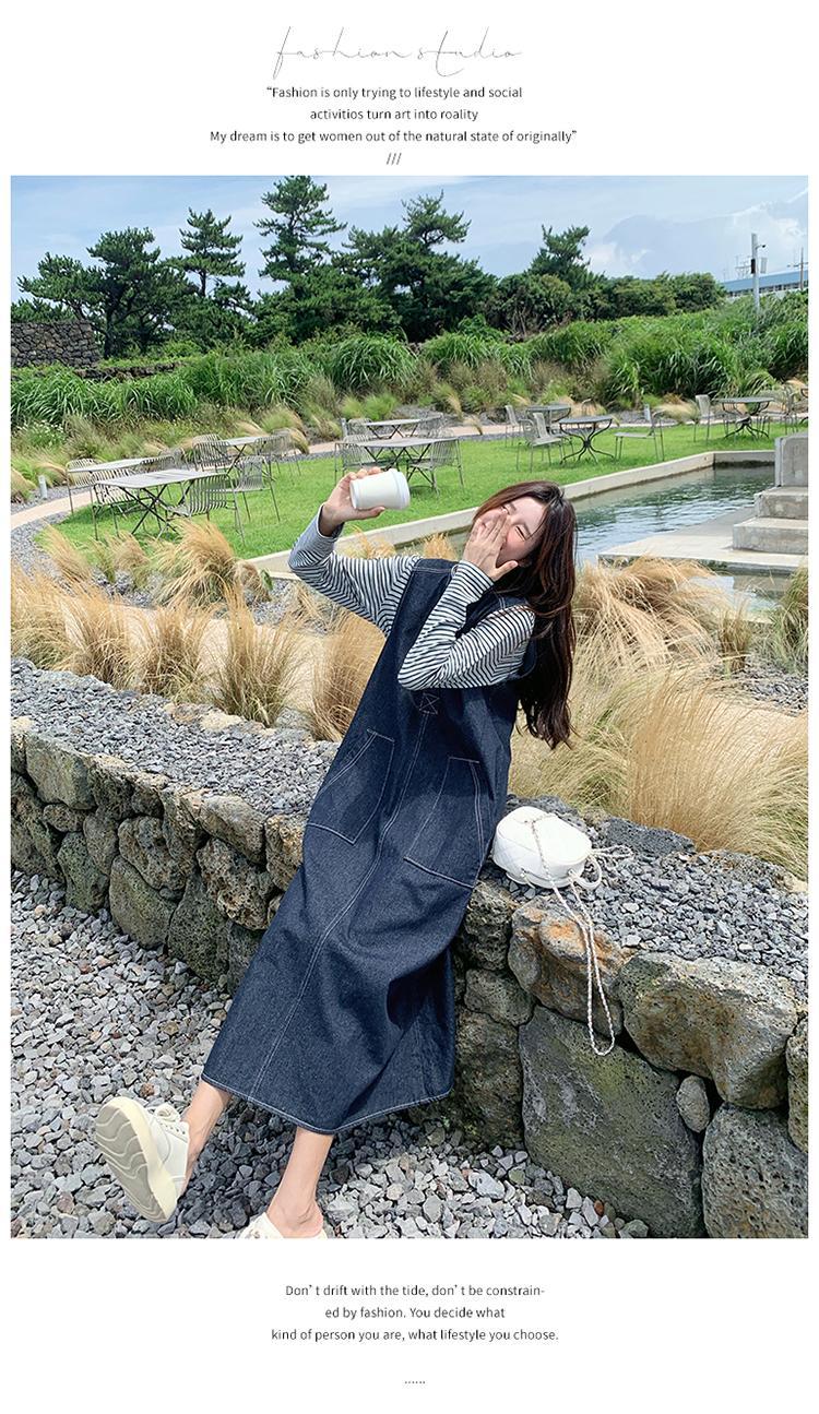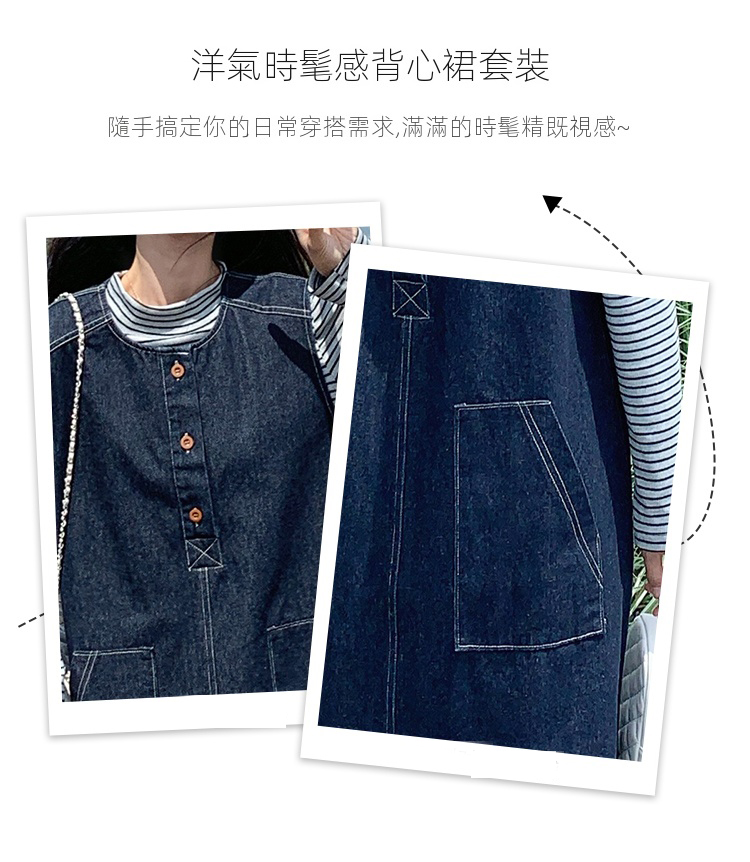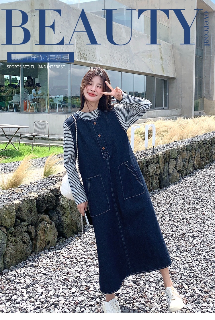 【單件/套裝】韓系條紋顯瘦上衣+復古牛仔背心洋裝兩件套