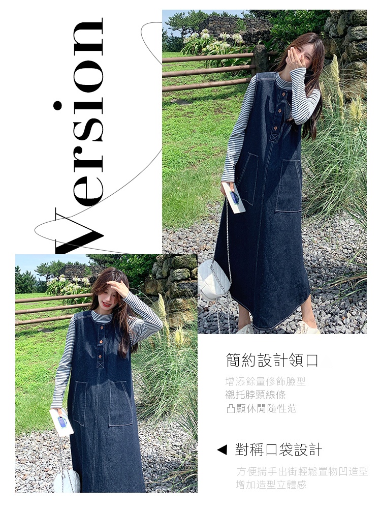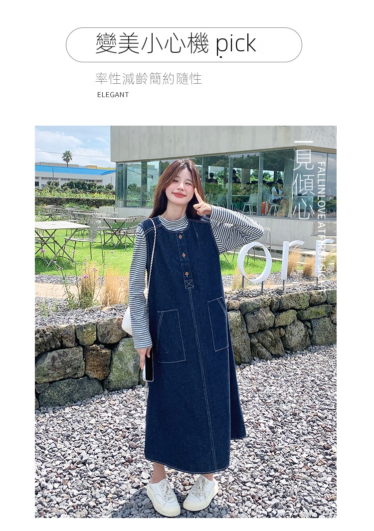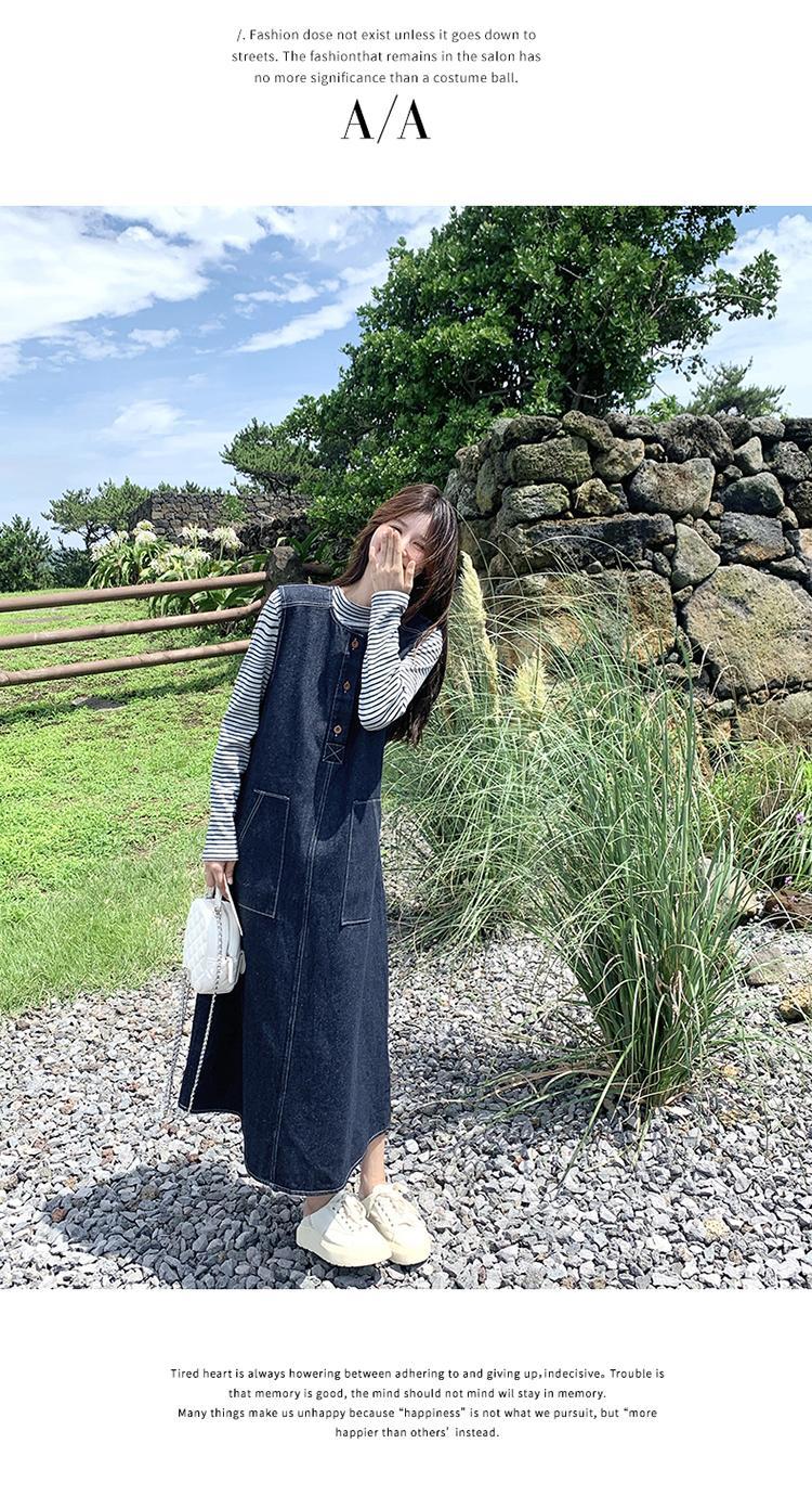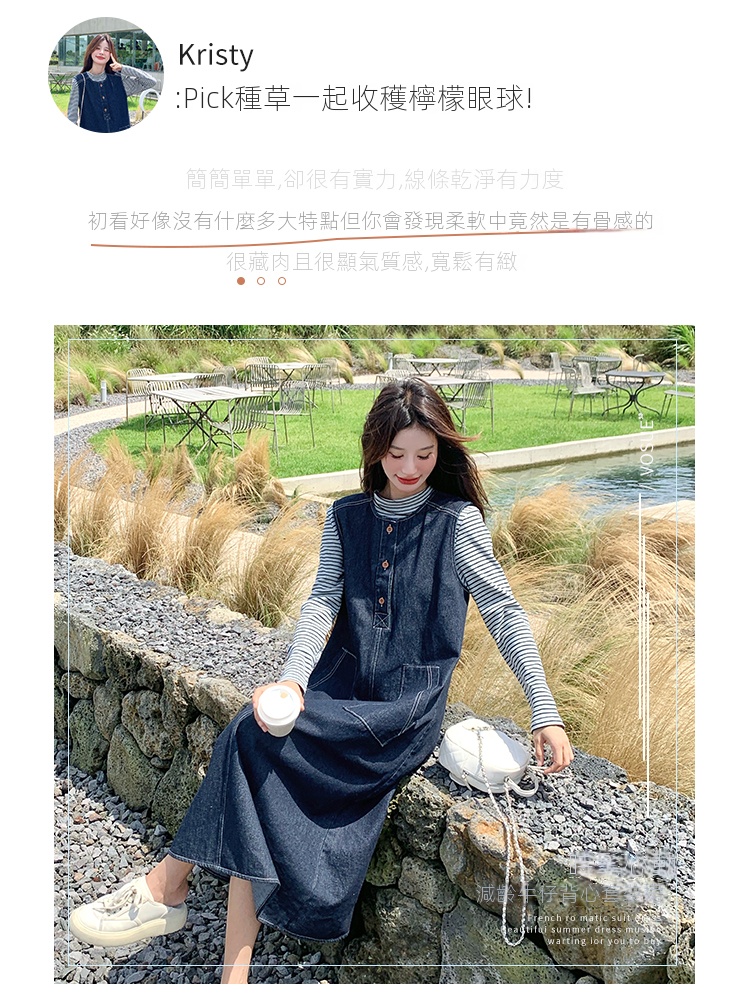 【單件/套裝】韓系條紋顯瘦上衣+復古牛仔背心洋裝兩件套-HaloBless