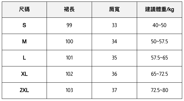 此處給出的參考尺寸表只是一個標準指南