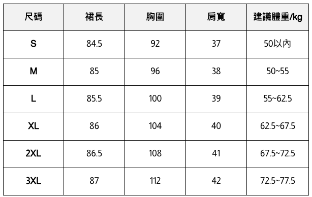 - 此處給出的參考尺寸表只是一個標準指南