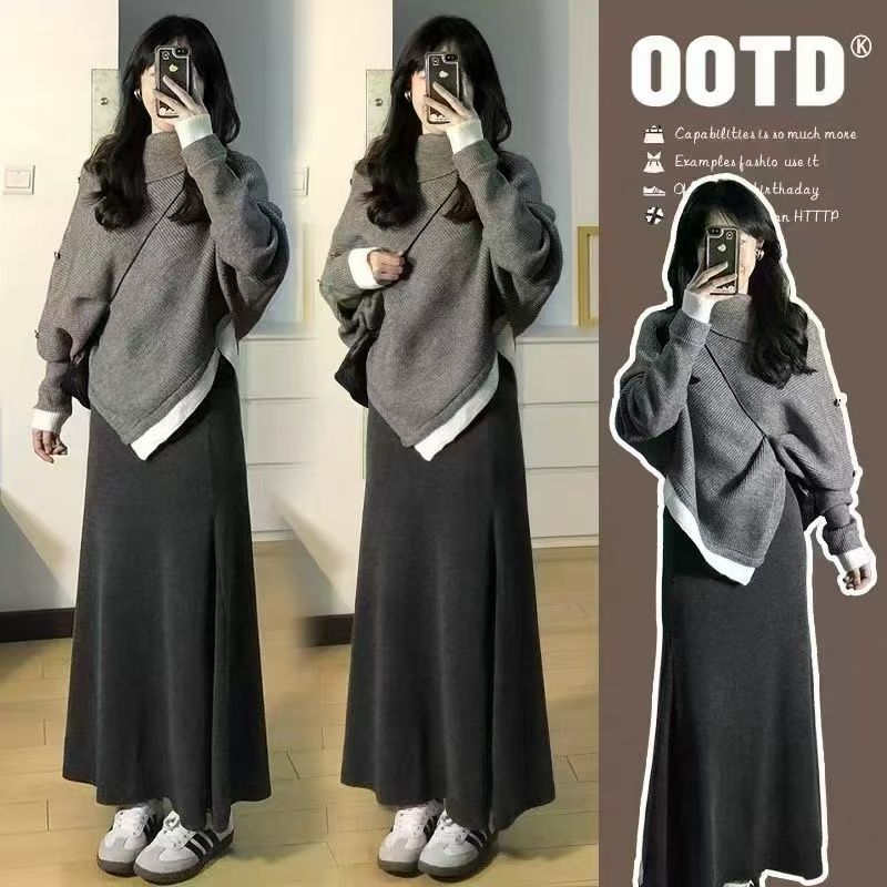【單件/套裝】氣質高級感不規則高領針織毛衣+百搭收腰長裙兩件套