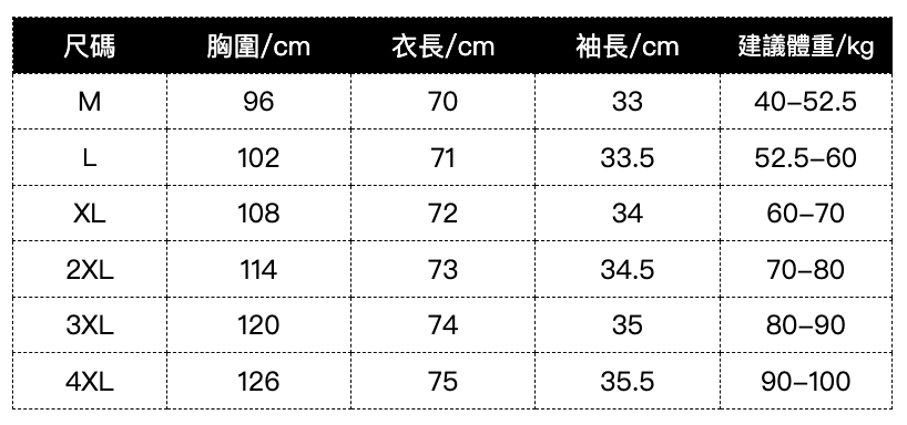 此處給出的參考尺寸表只是一個標準指南