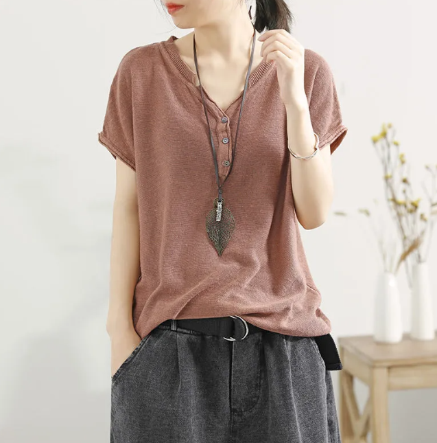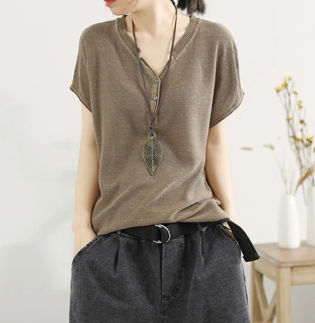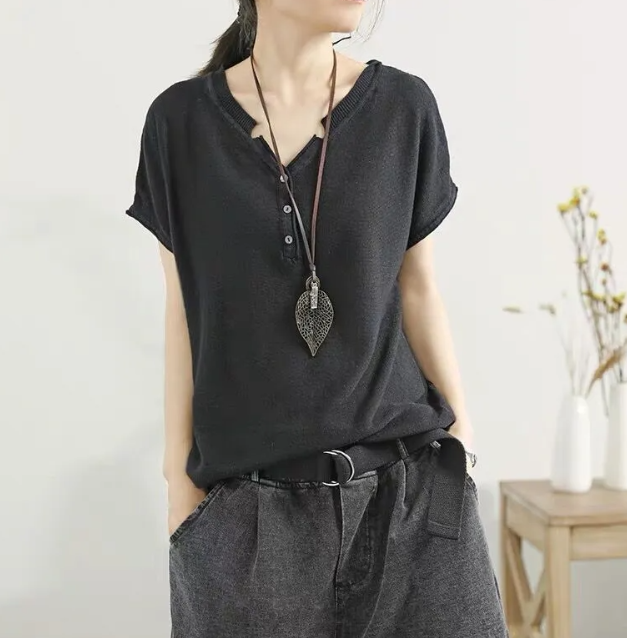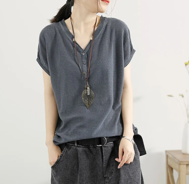 冰絲針織V領韓版套頭薄款打底寬鬆短袖