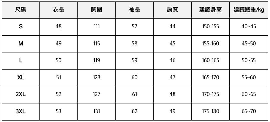 此處給出的參考尺寸表只是一個標準指南