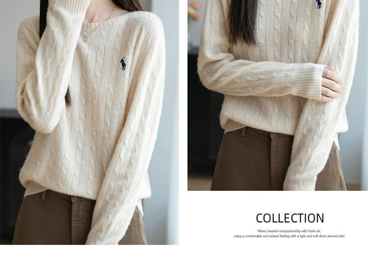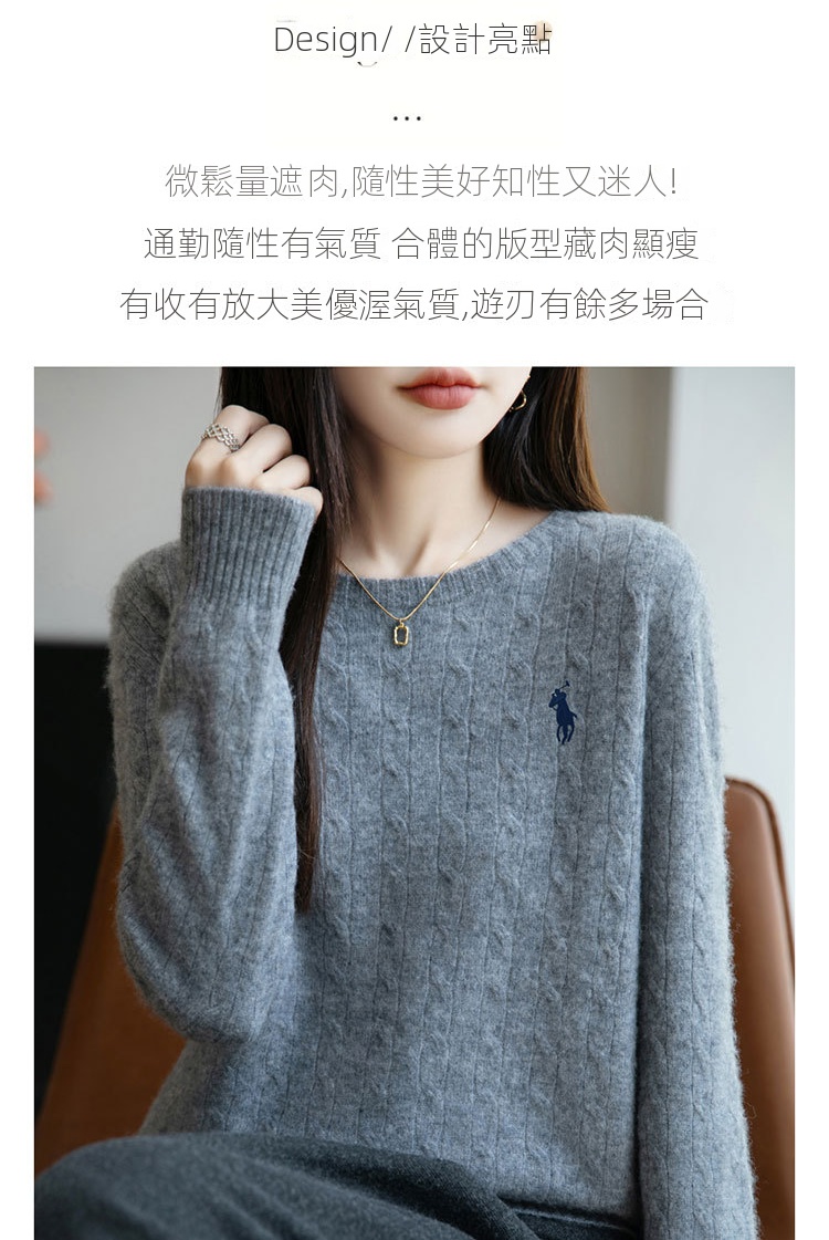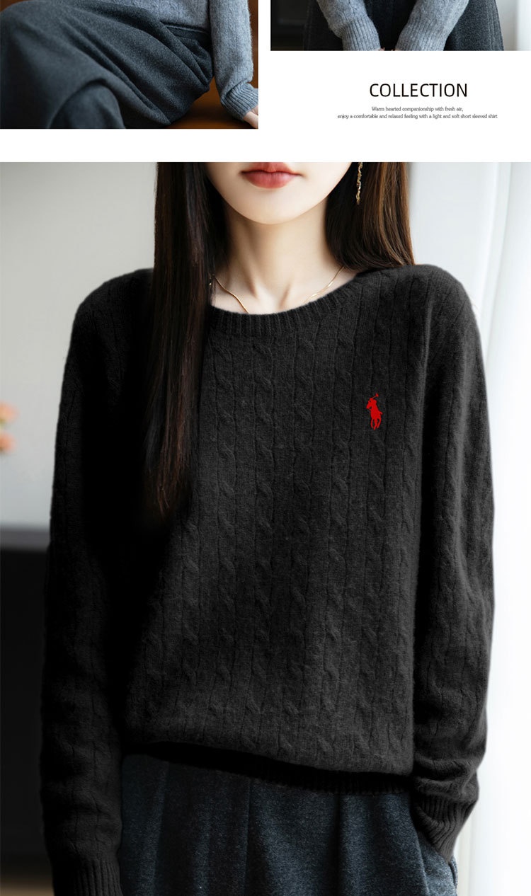 圓領小马刺繡打底復古長袖麻花針織毛衣