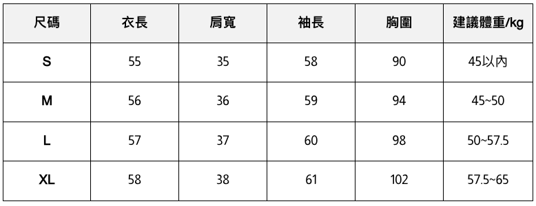 此處給出的參考尺寸表只是一個標準指南
