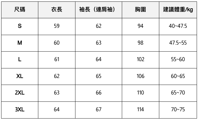 - 此處給出的參考尺寸表只是一個標準指南