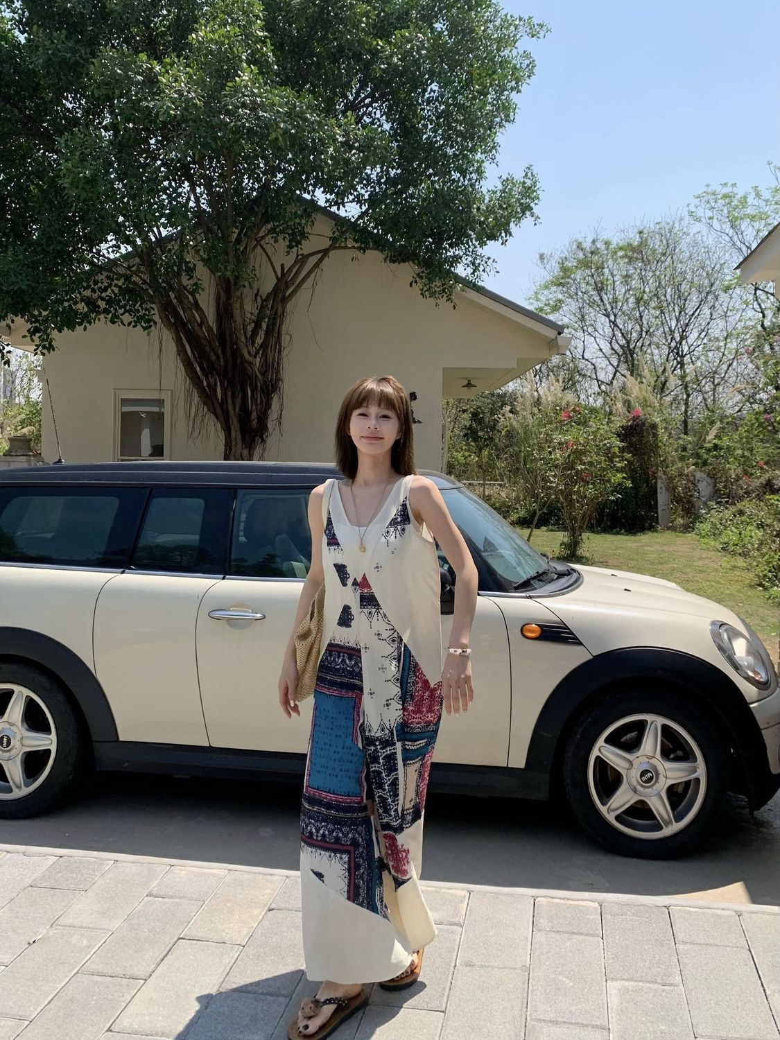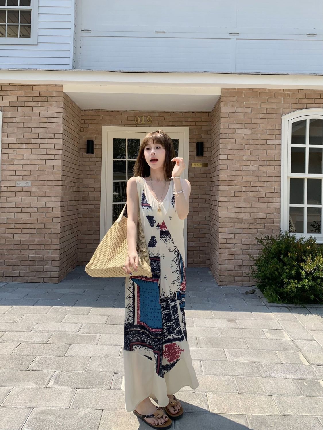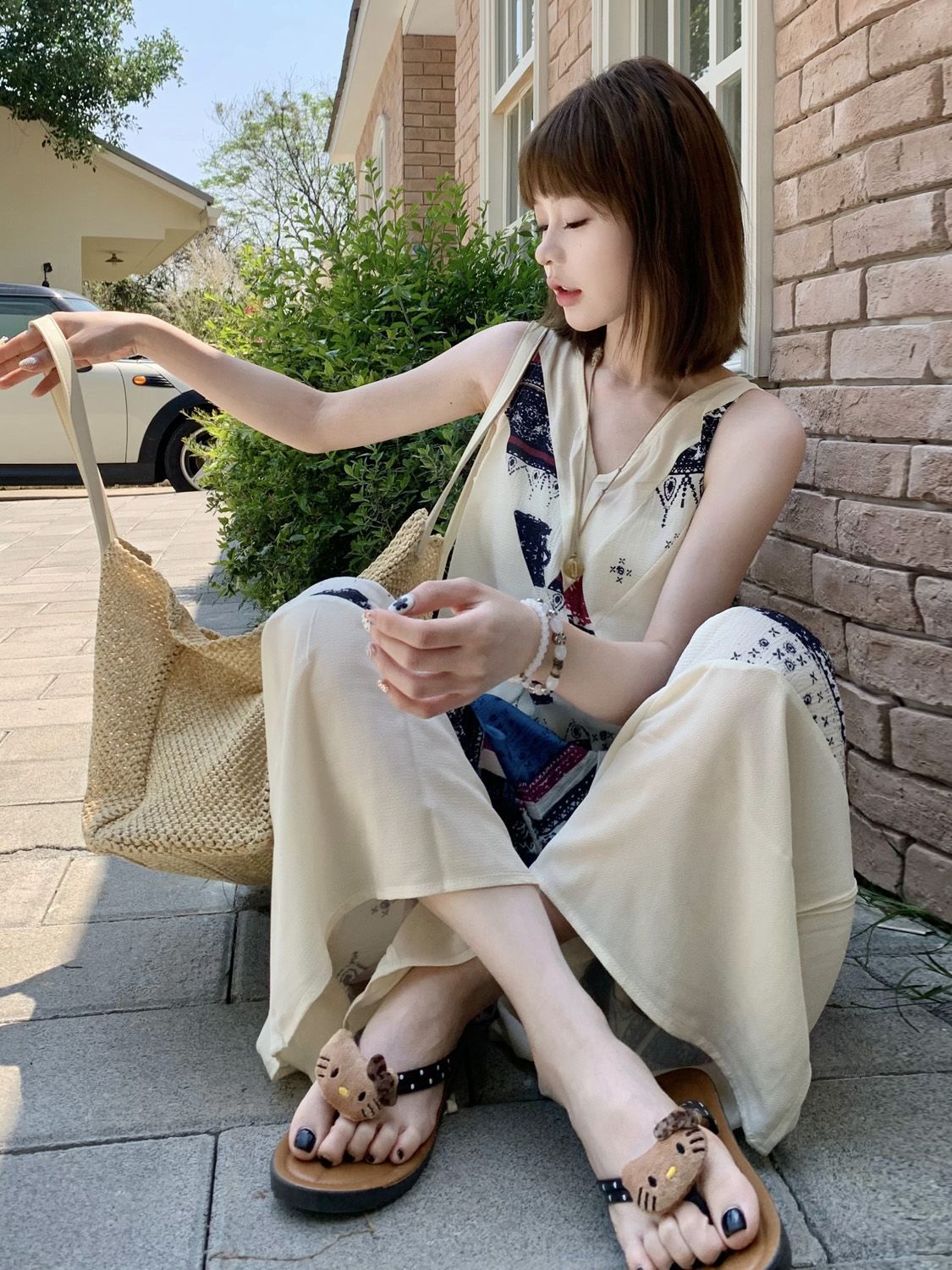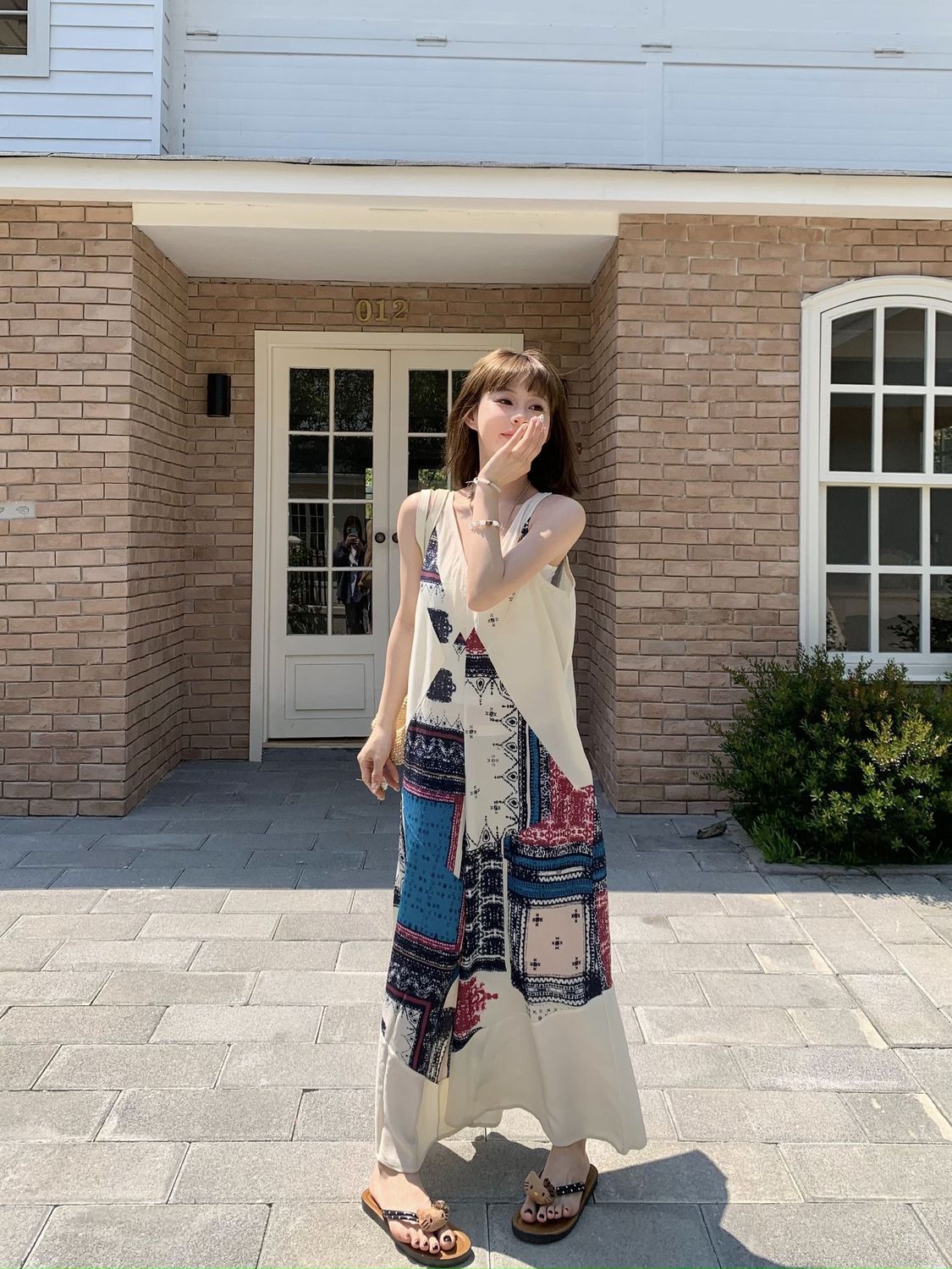 海島風V領無袖復古印花休閒闊腿背帶連體褲