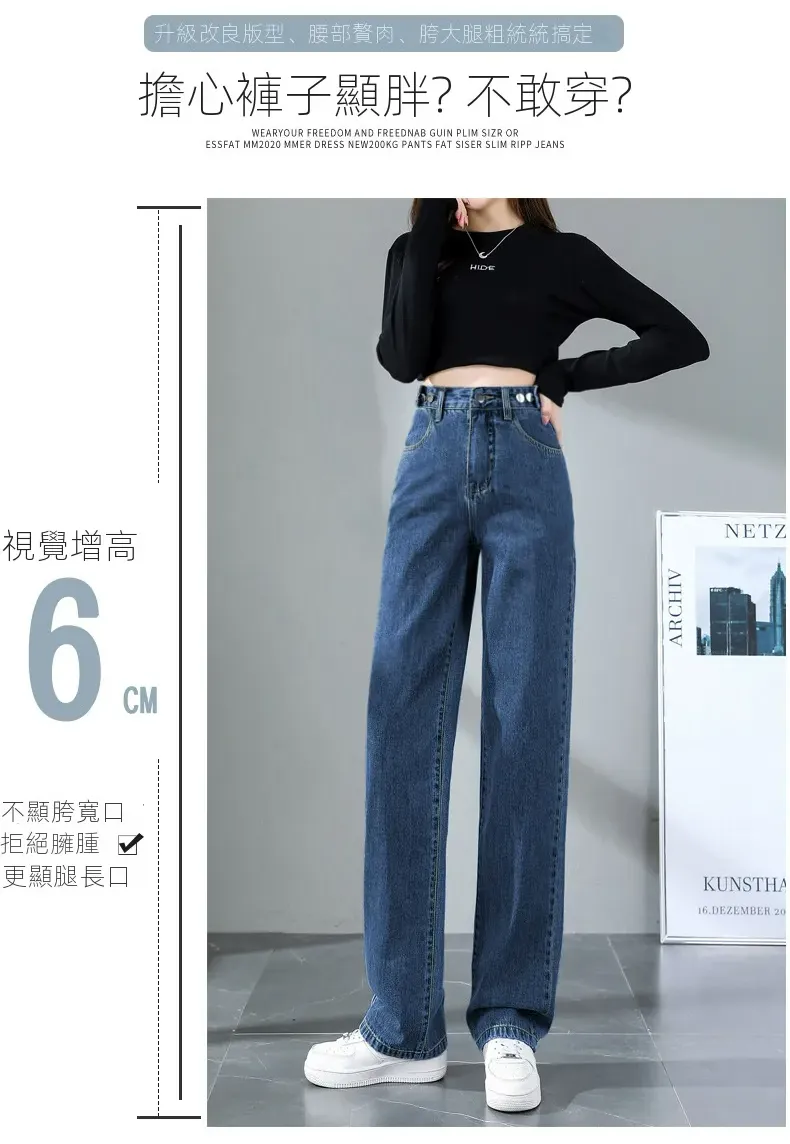 復古藍高腰顯瘦大碼寬鬆百搭闊腿牛仔褲