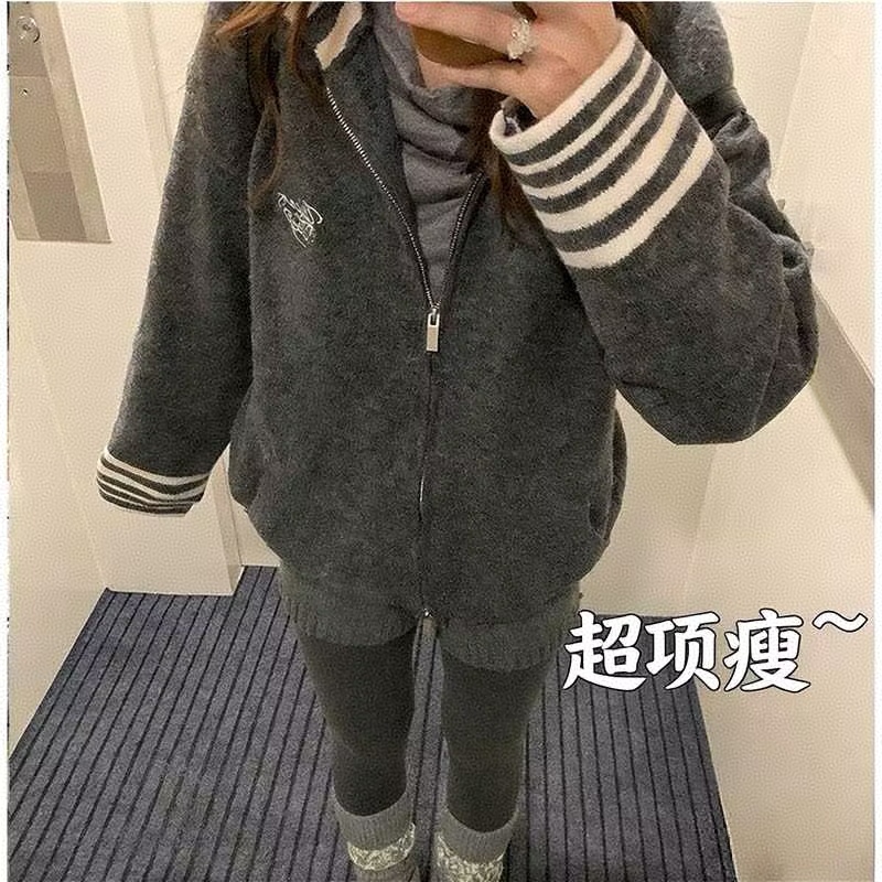 【整套】刷毛時尚長袖連帽外套+休閒束脚褲兩件套裝
