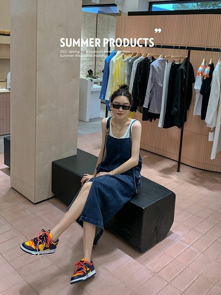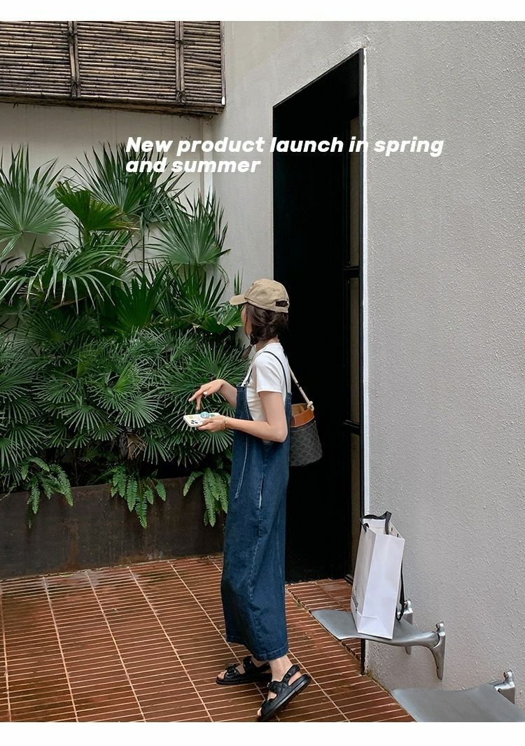 寬鬆減齡宽鬆型薄款開叉吊帶牛仔洋裝