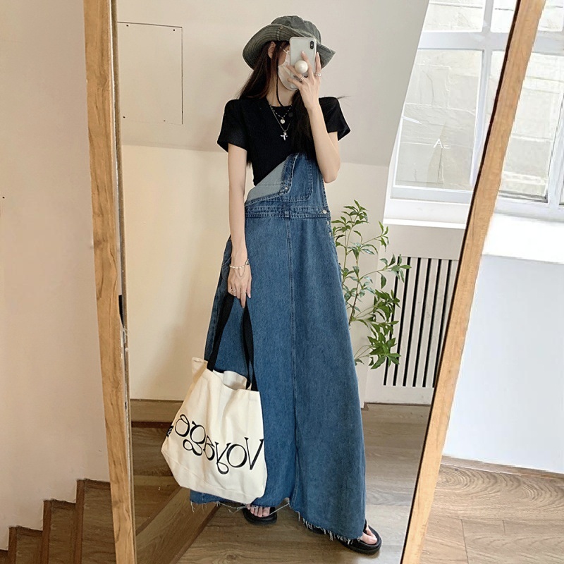 日韓復古減齡寬鬆大擺毛邊長裙牛仔背帶裙