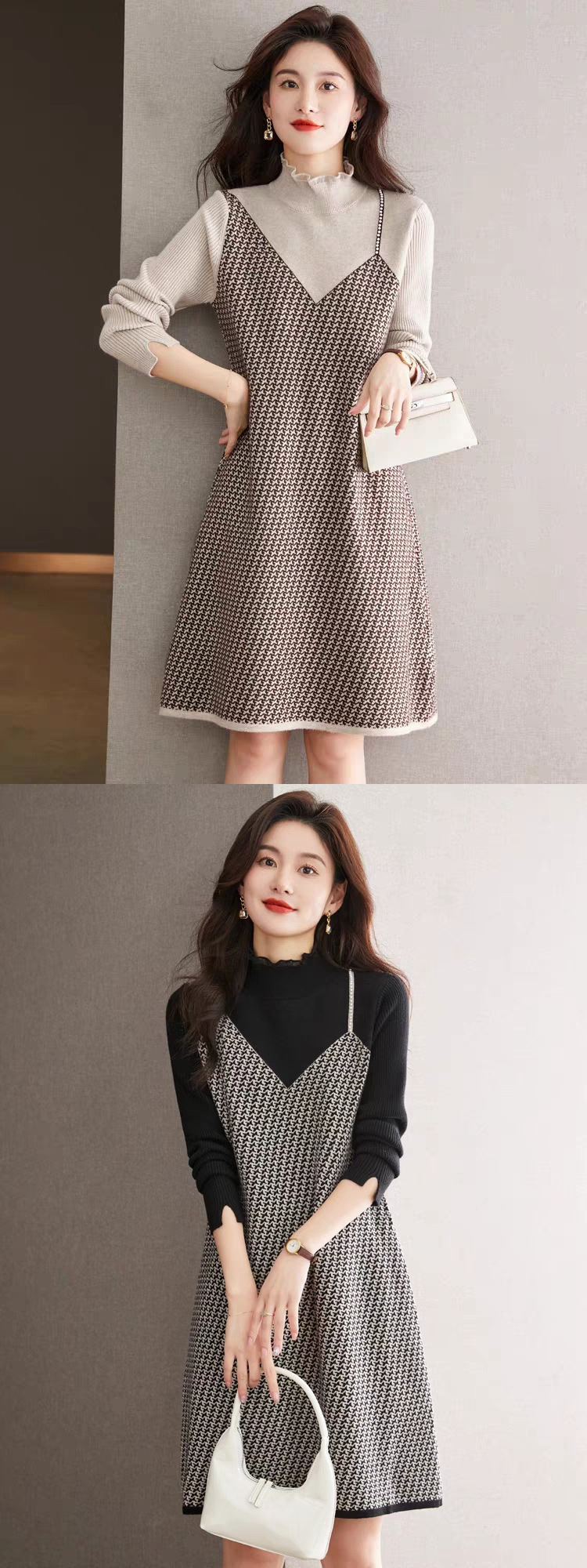 千鳥格內搭針織中長打底裙法式洋裝