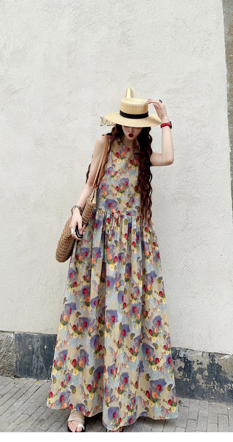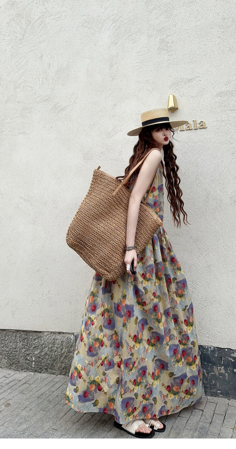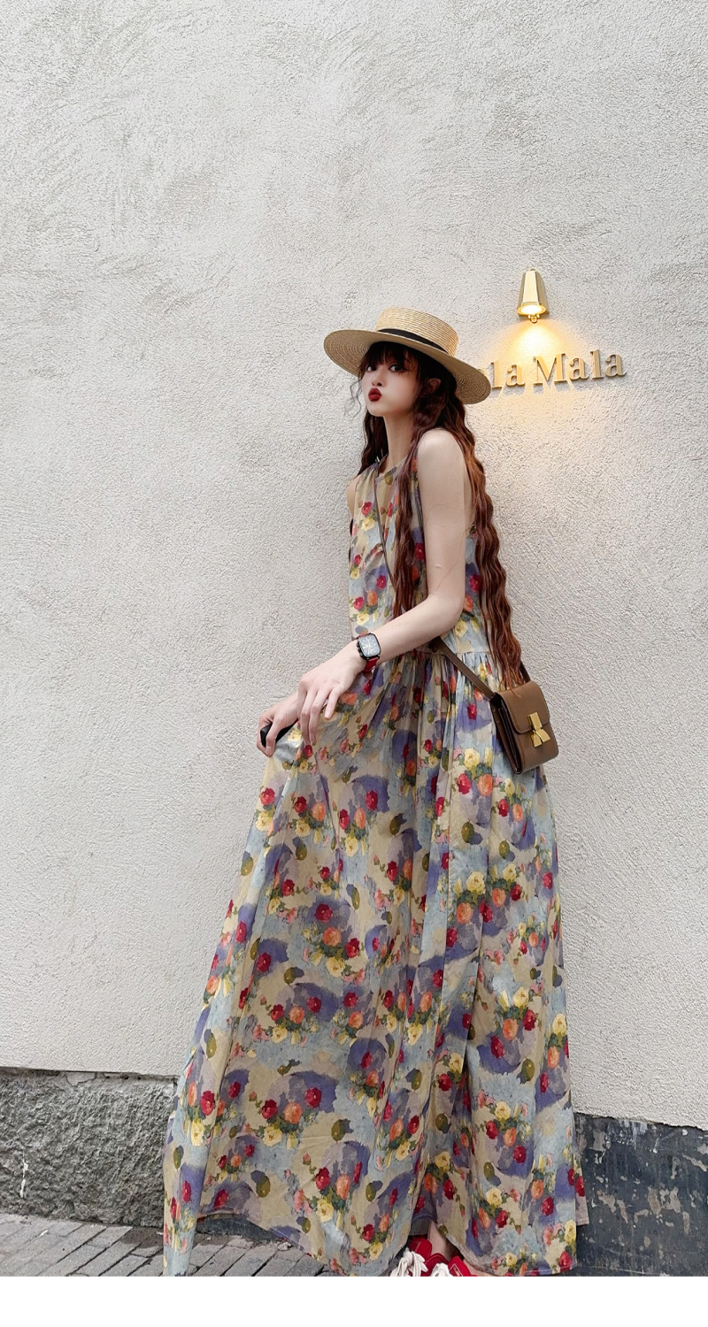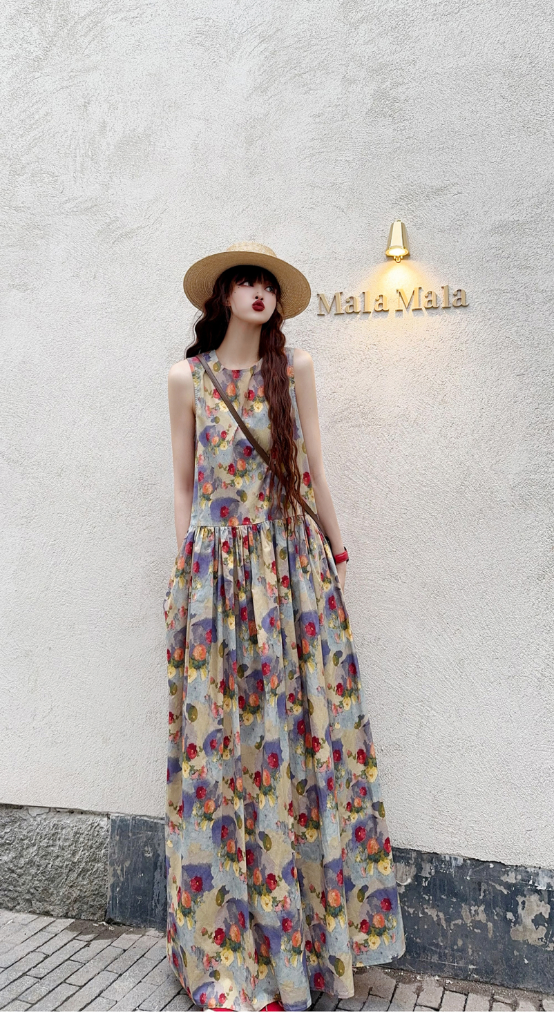 長款及踝油畫風復古印花減齡A字甜美洋裝