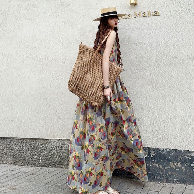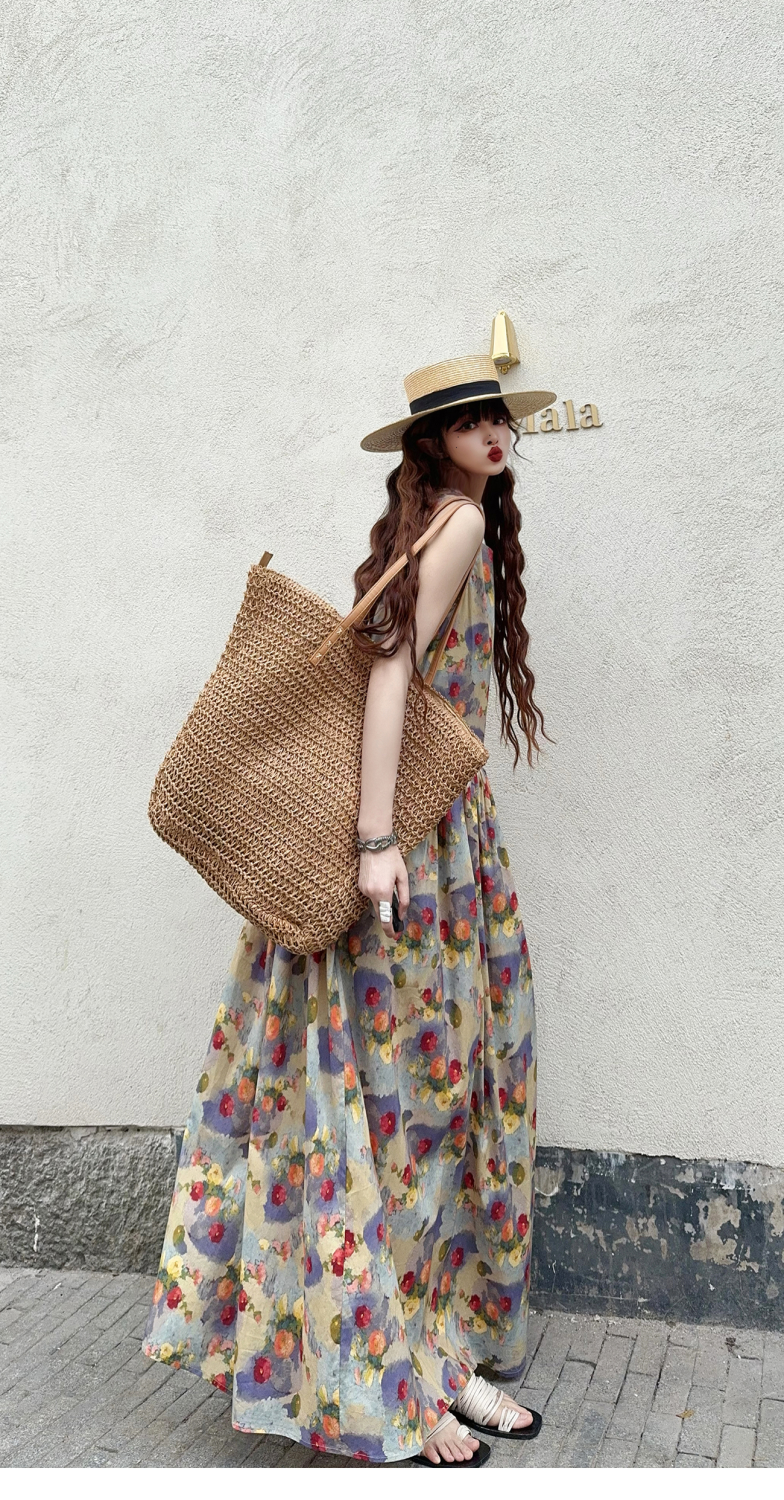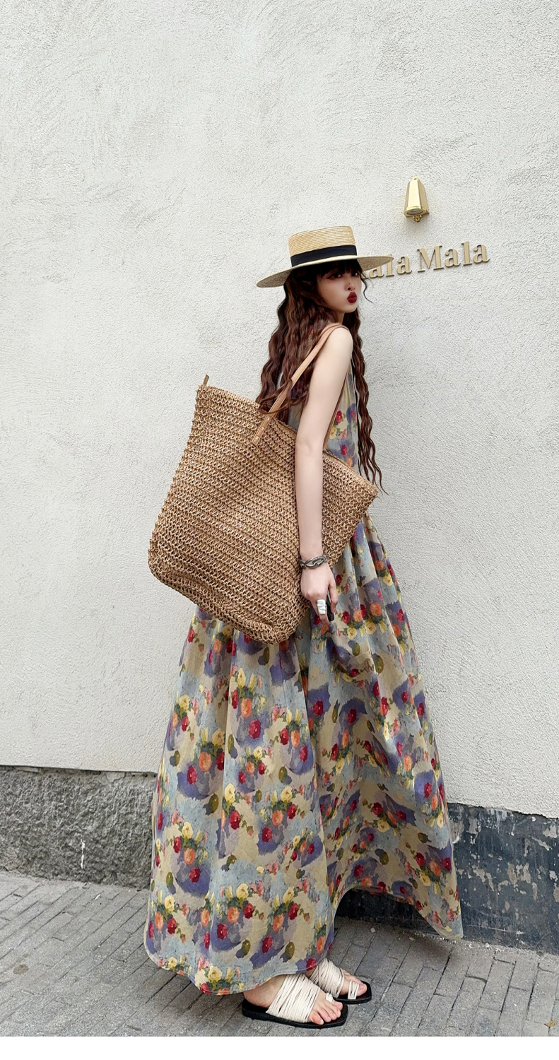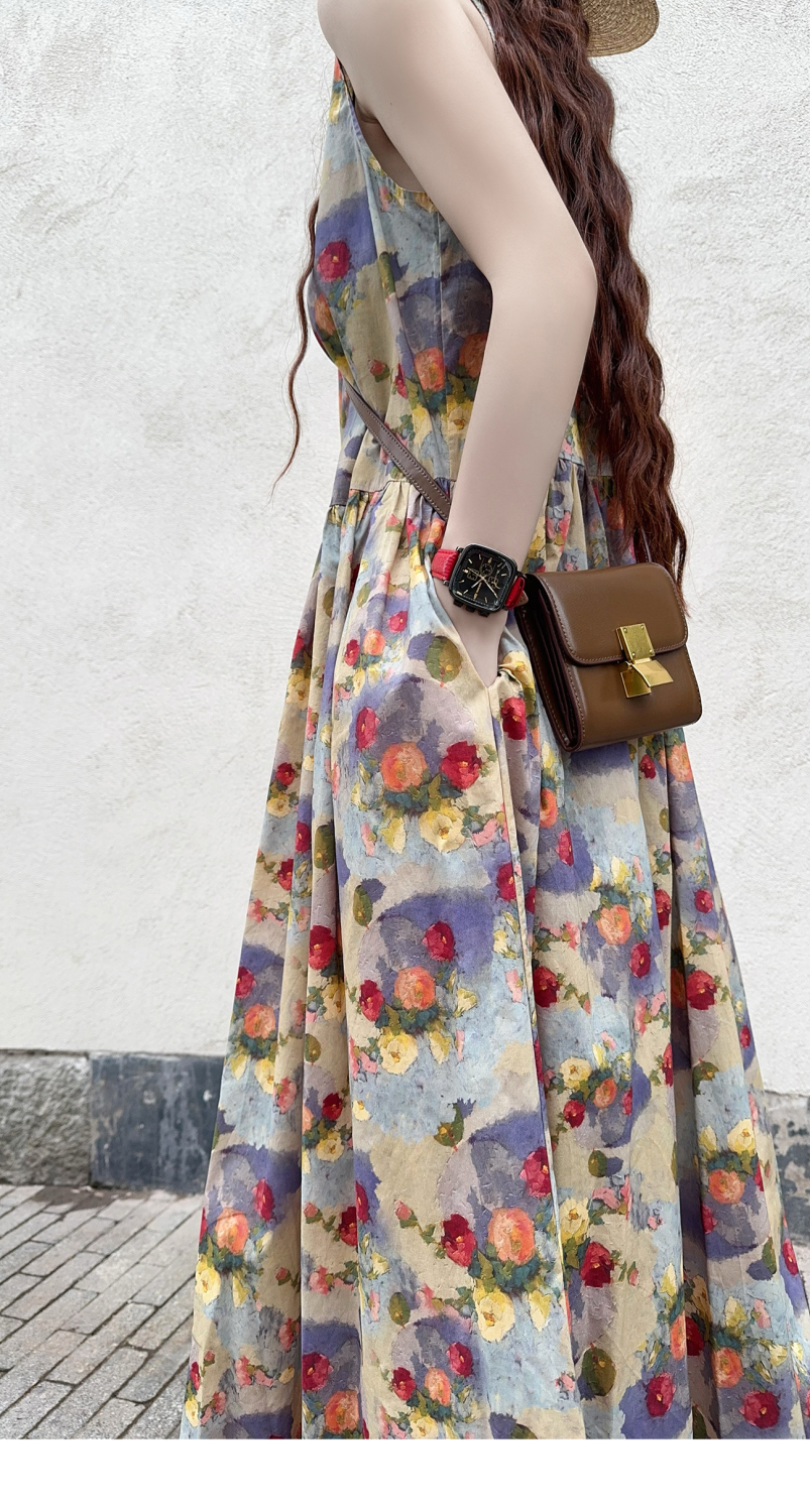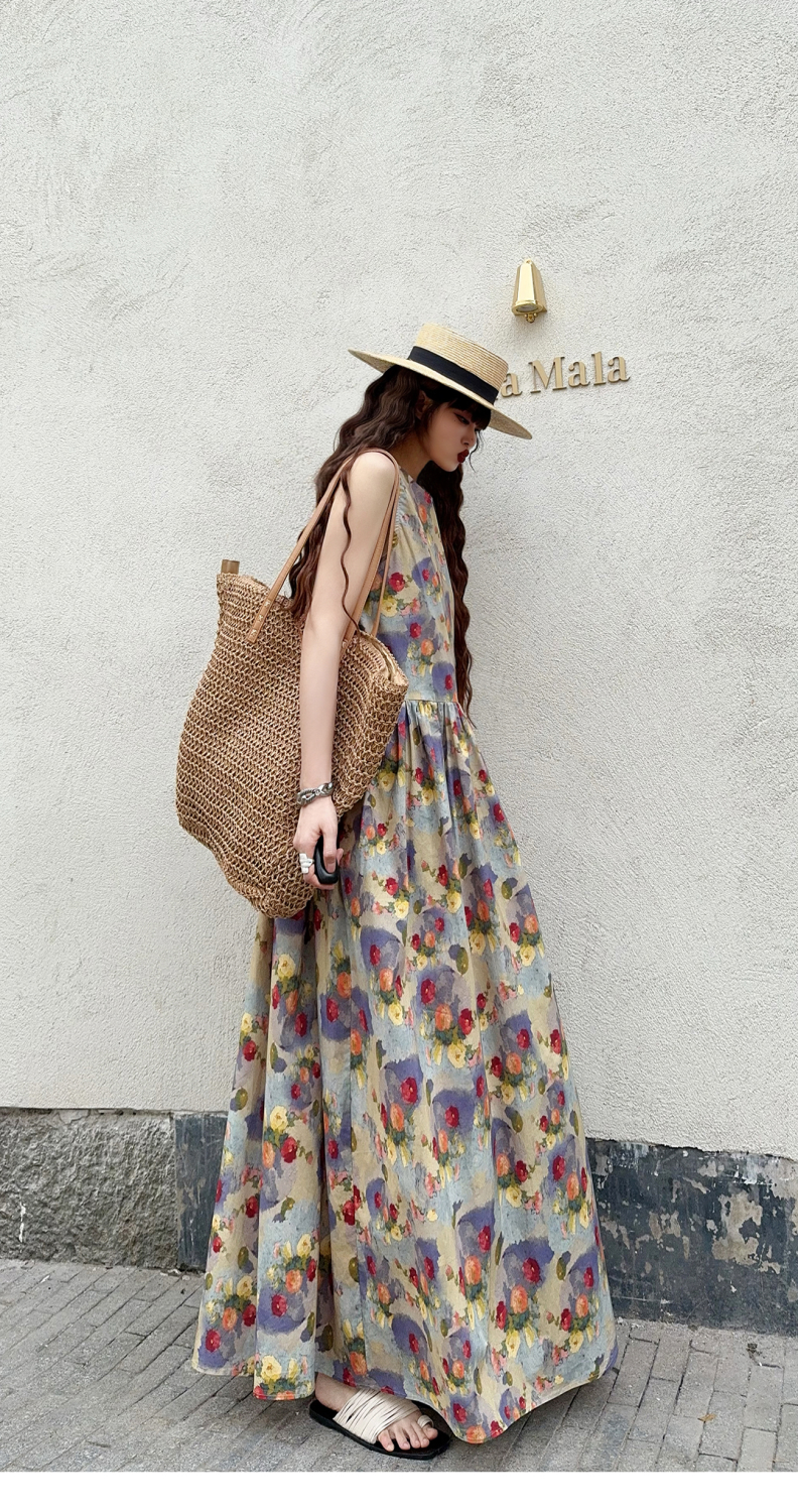 長款及踝油畫風復古印花減齡A字甜美洋裝