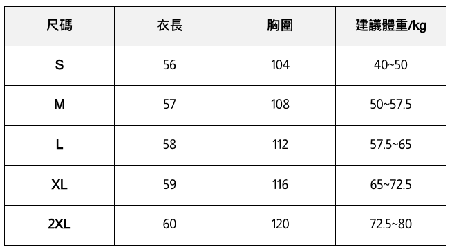 此處給出的參考尺寸表只是一個標準指南