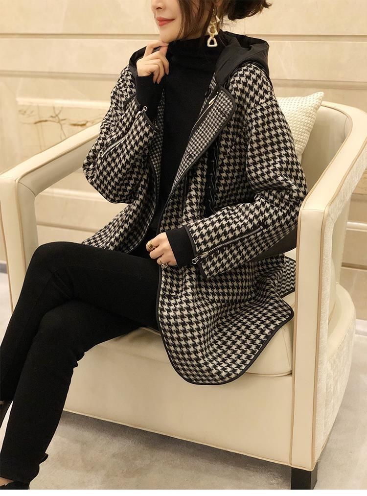 時尚寬鬆顯瘦連帽千鳥格中長毛呢外套