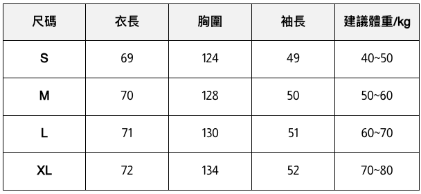 此處給出的參考尺寸表只是一個標準指南