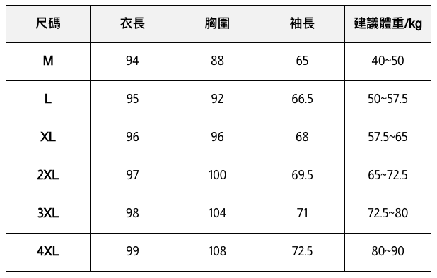 此處給出的參考尺寸表只是一個標準指南