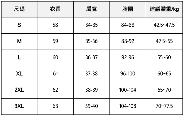 此處給出的參考尺寸表只是一個標準指南
