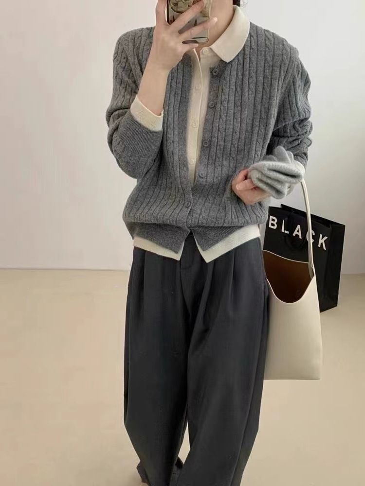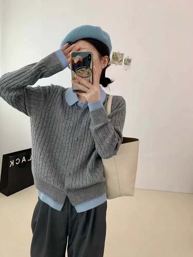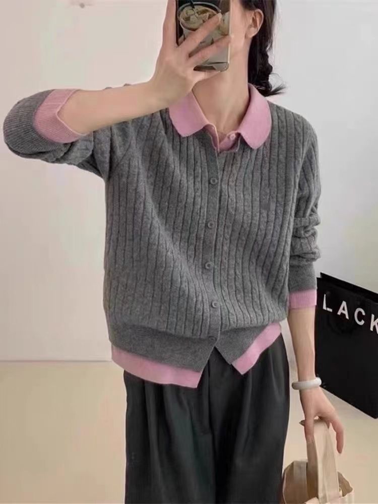 小眾洋氣撞色翻領毛衣設計感假兩件針織開衫