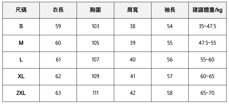 此處給出的參考尺寸表只是一個標準指南