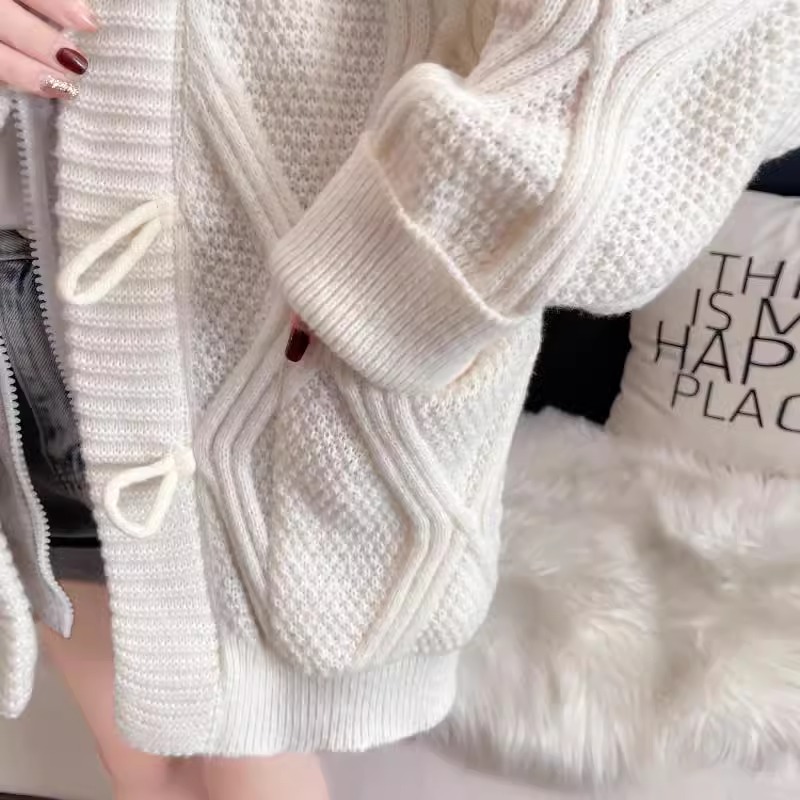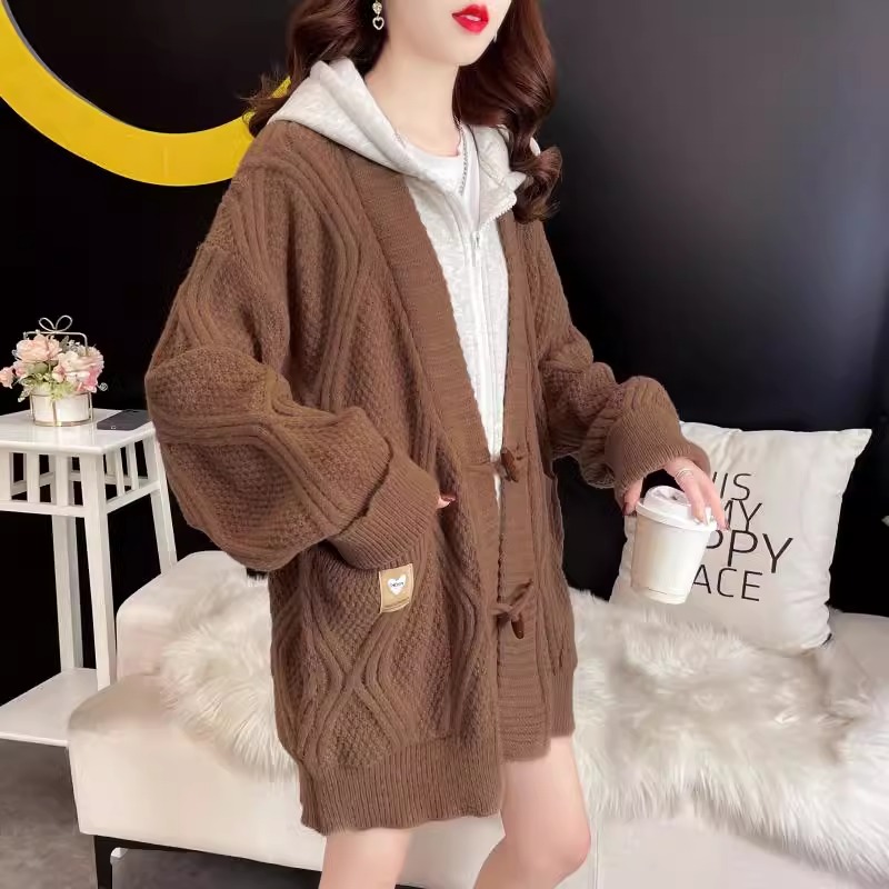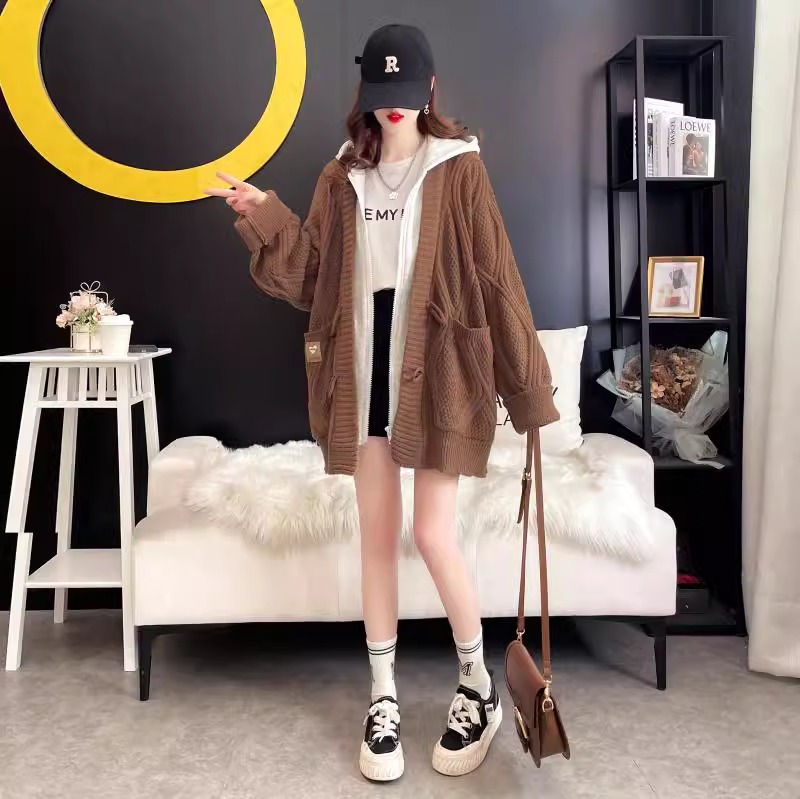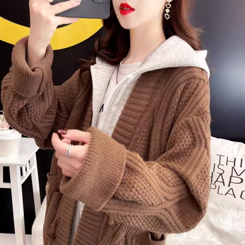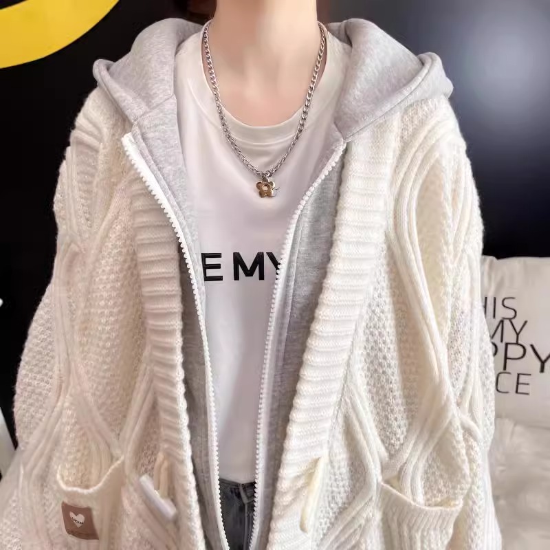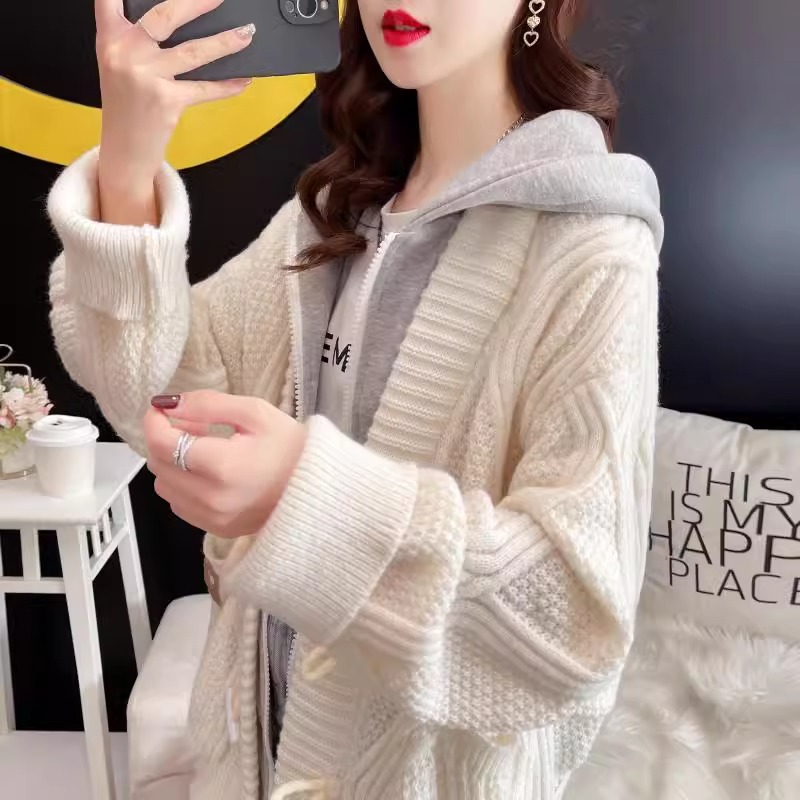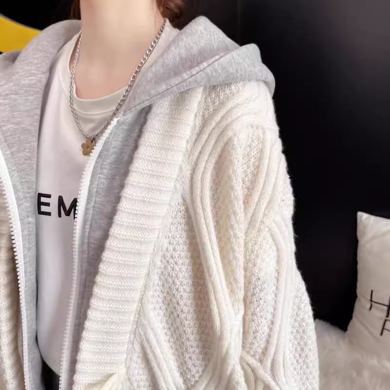 假兩件連帽寬鬆慵懶風中長版針織開衫