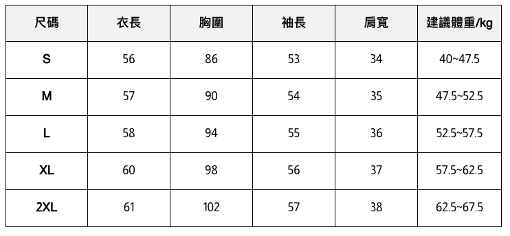 此處給出的參考尺寸表只是一個標準指南