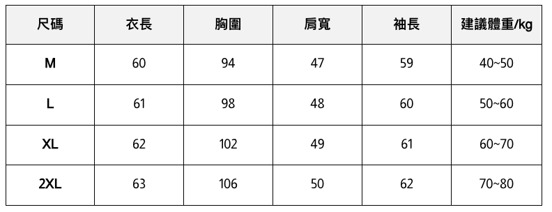 此處給出的參考尺寸表只是一個標準指南