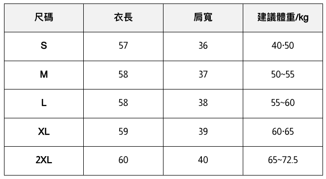 - 此處給出的參考尺寸表只是一個標準指南
