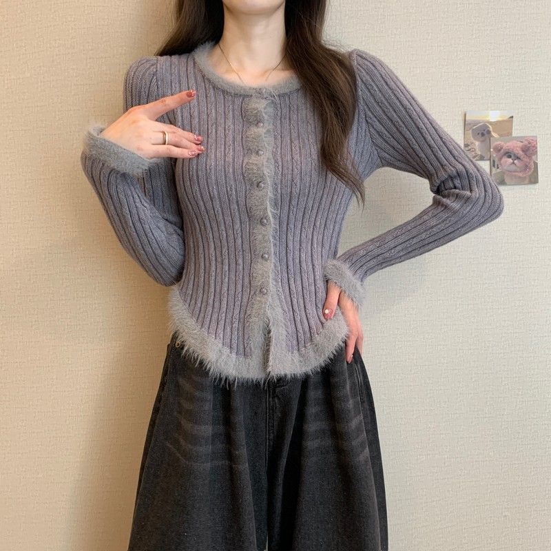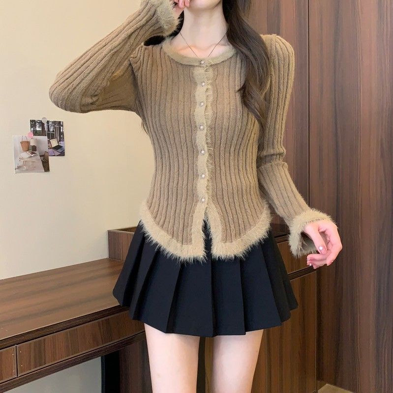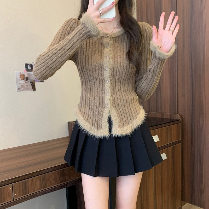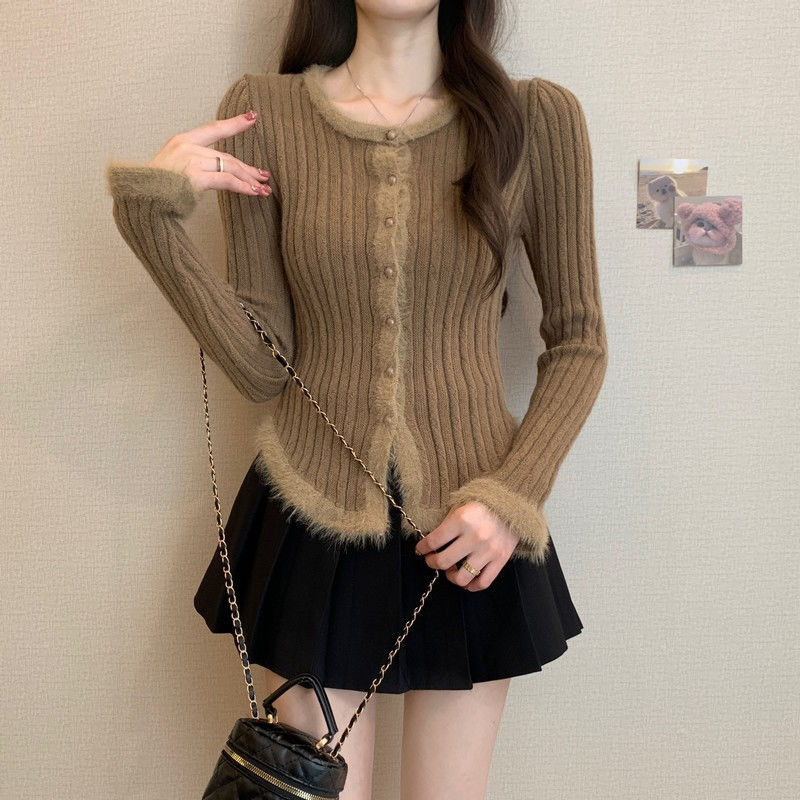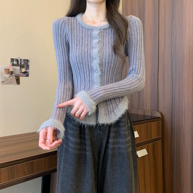 3色美拉德復古拼接毛邊修身顯瘦針織上衣