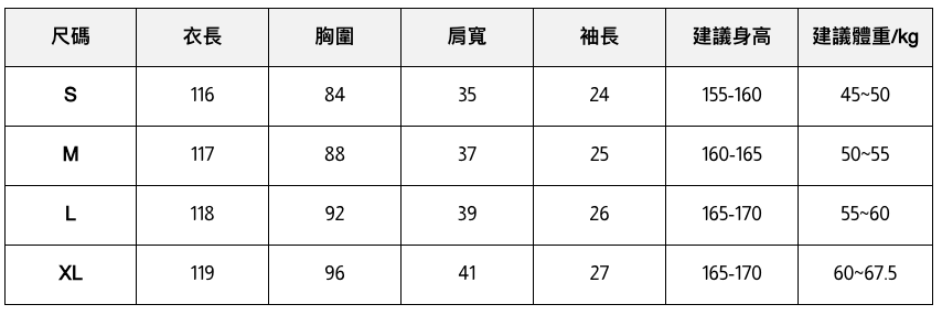 此處給出的參考尺寸表只是一個標準指南