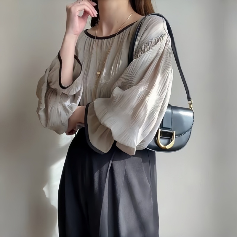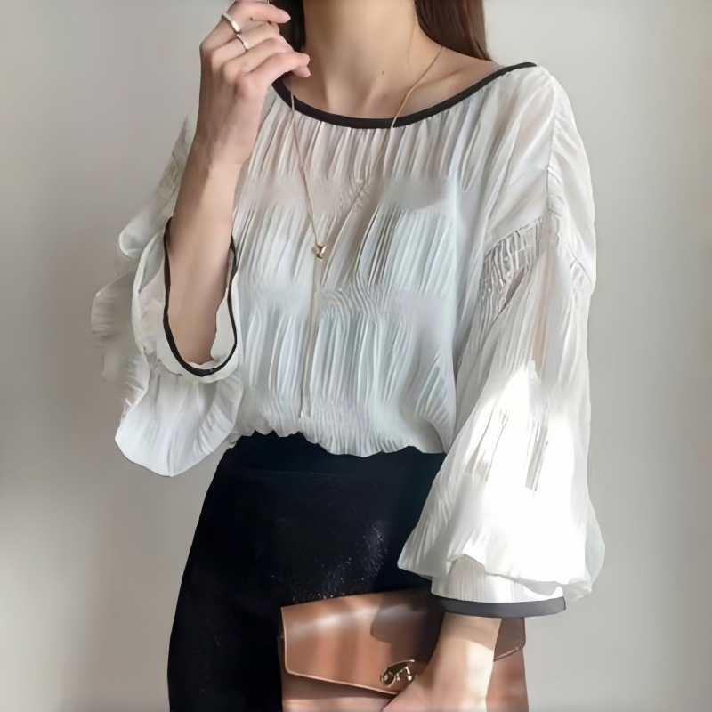 日韓素色肌理感壓褶泡泡袖圓領套頭雪紡衫
