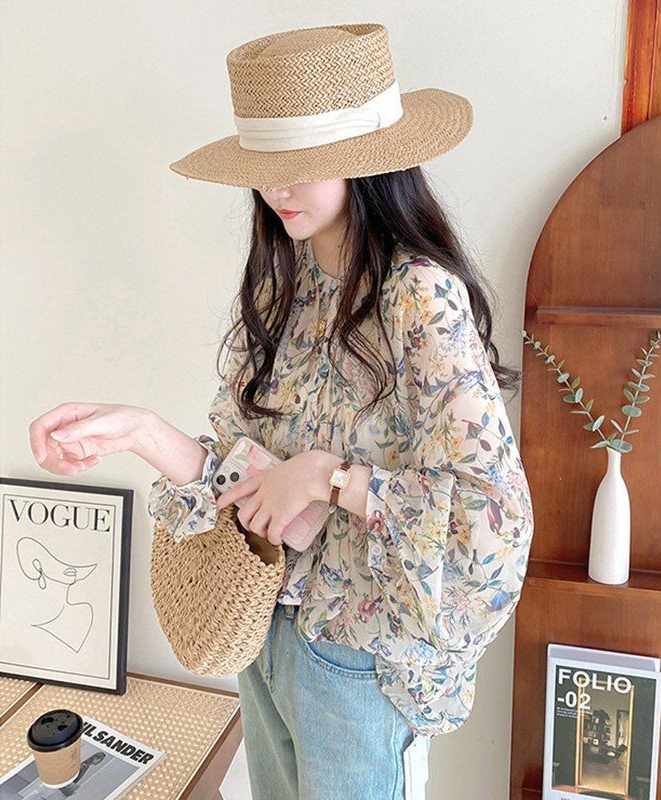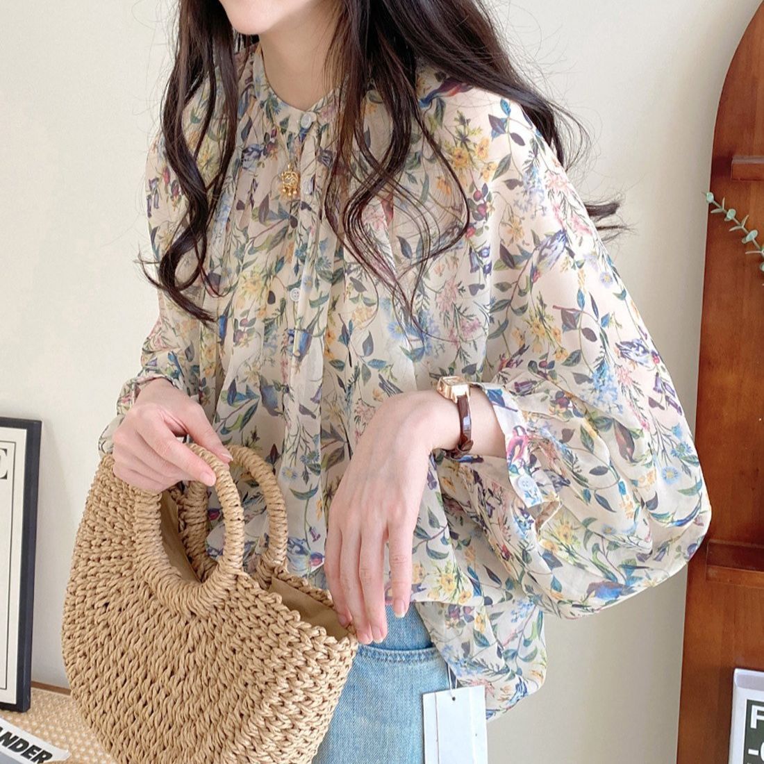 雪紡碎花寬鬆薄紗燈籠袖防曬襯衫