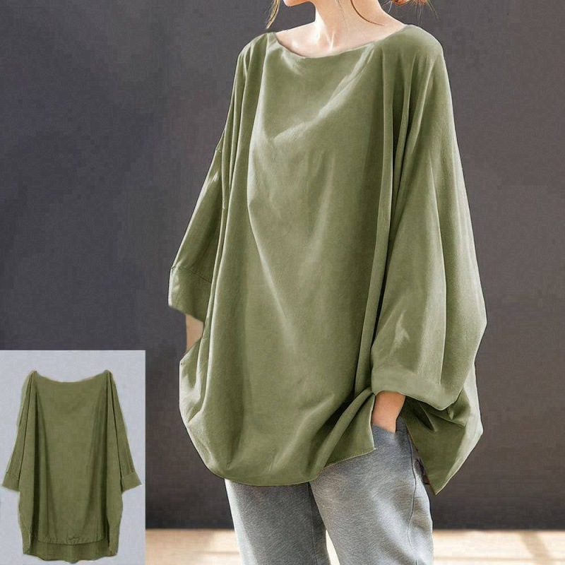 日韩休闲圓領蝙蝠袖寬鬆素色長袖T恤