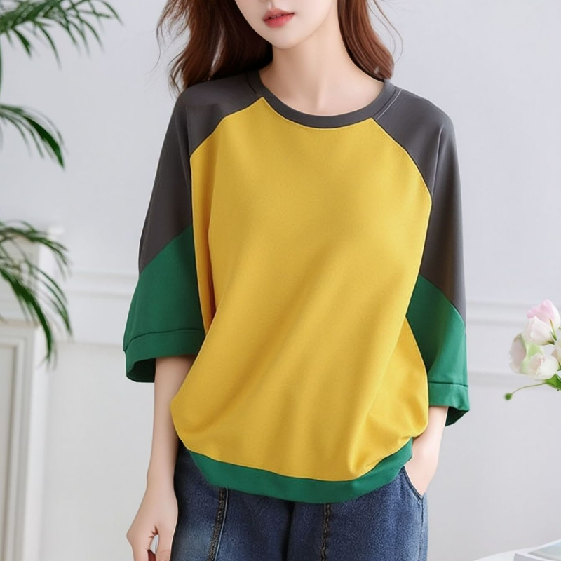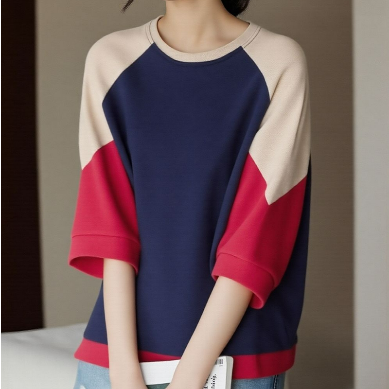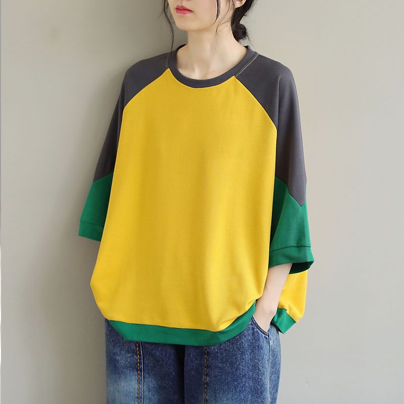 純棉寬鬆圓領文藝休閒五分袖大碼撞色長袖