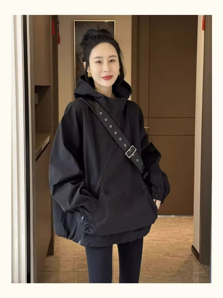 寬鬆連帽薄款透氣拉鏈不規則衝鋒衣外套