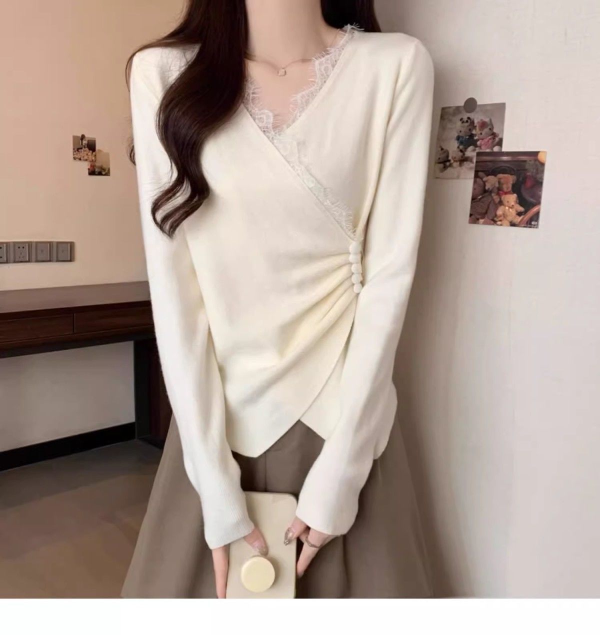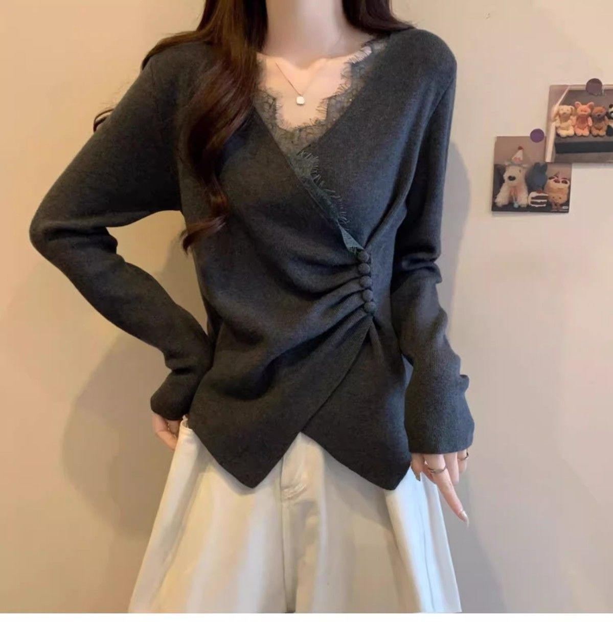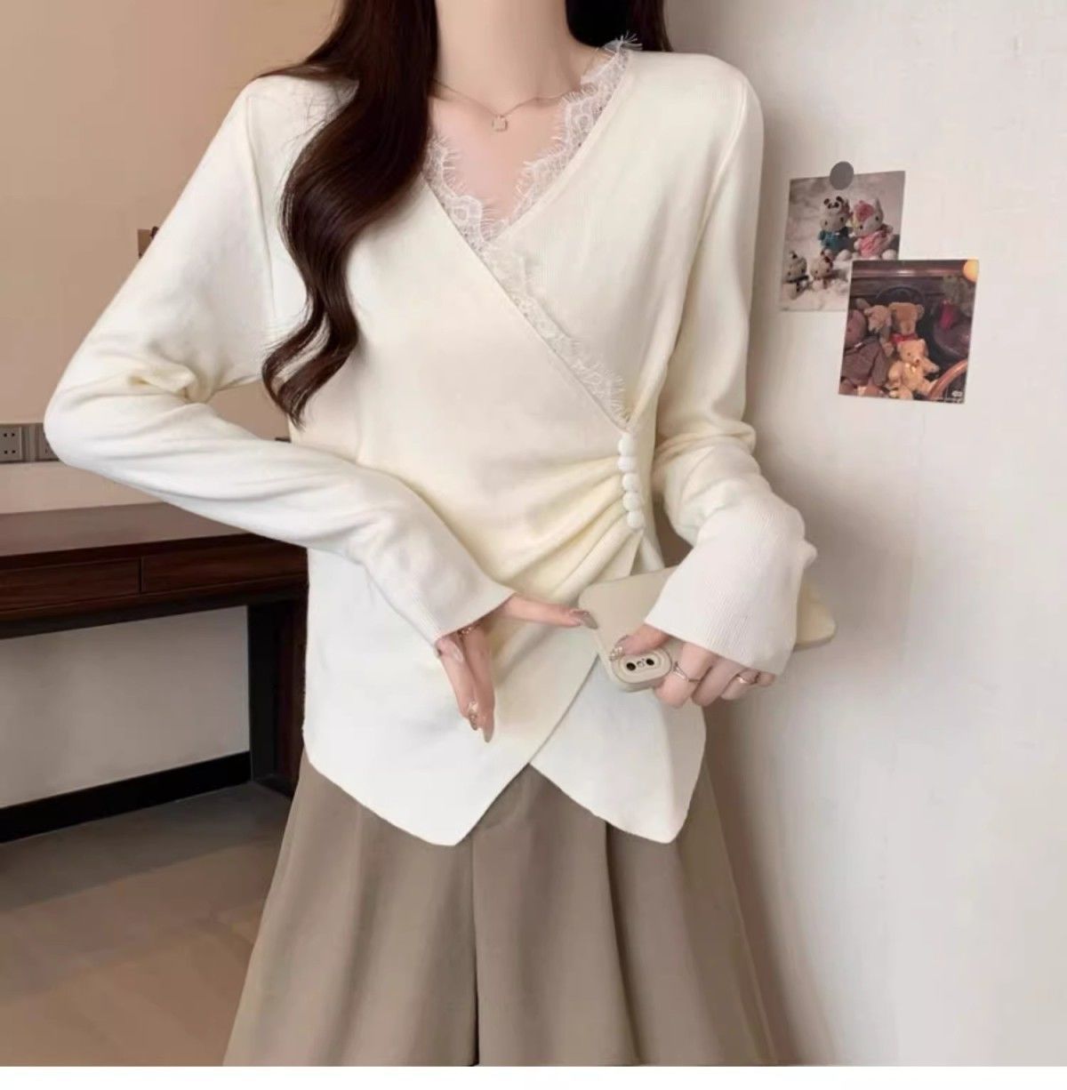 大碼德絨蕾絲拼接V領不規則交叉長袖T恤