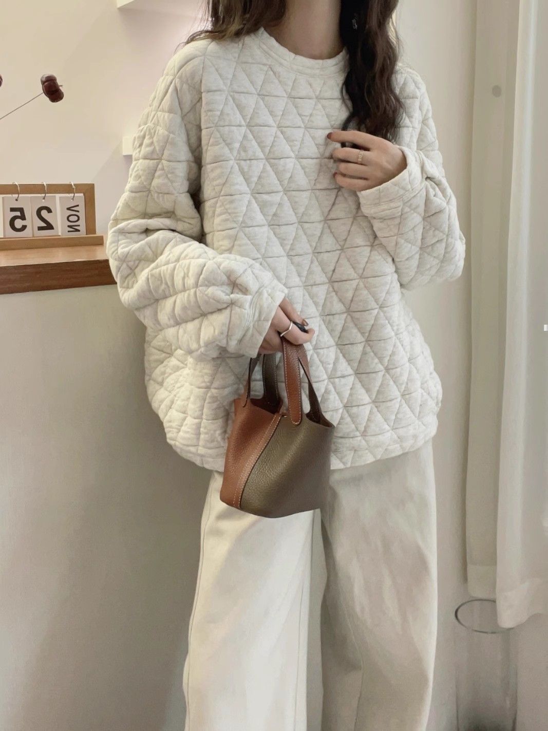 慵懶風加厚保暖寬鬆菱格夾棉上衣