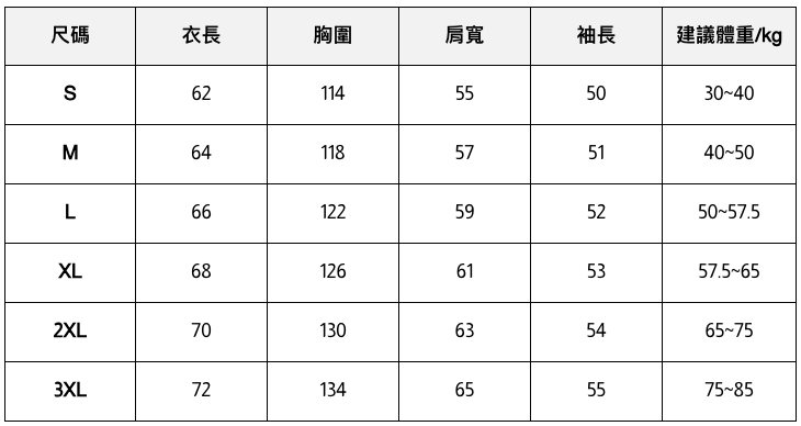 此處給出的參考尺寸表只是一個標準指南