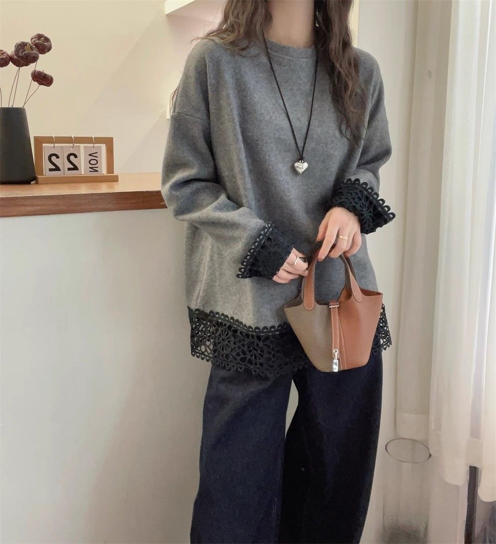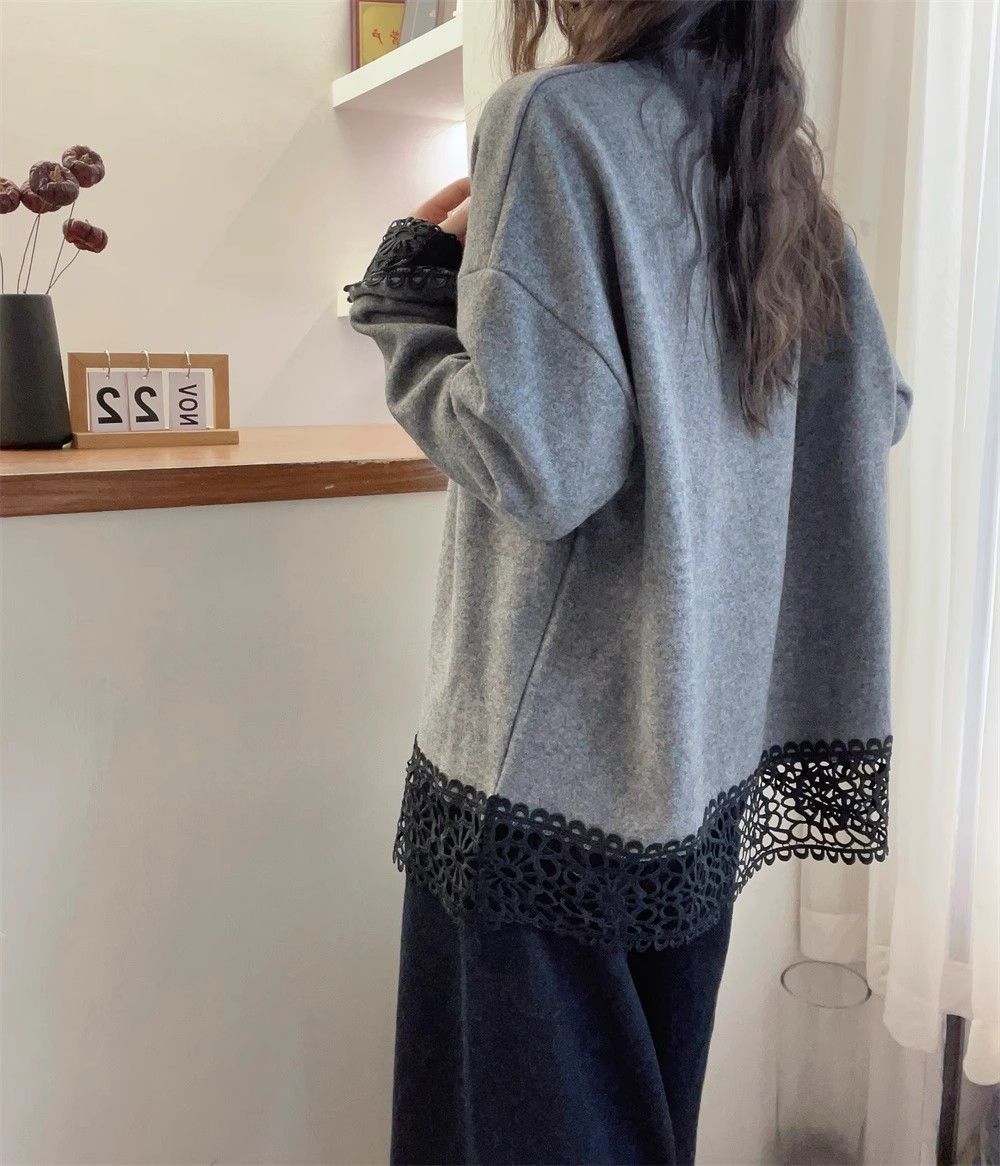 大碼雙面德絨蕾絲拼接寬鬆顯瘦長袖