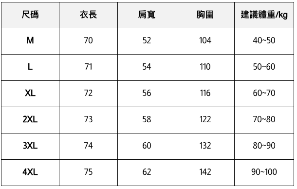 此處給出的參考尺寸表只是一個標準指南