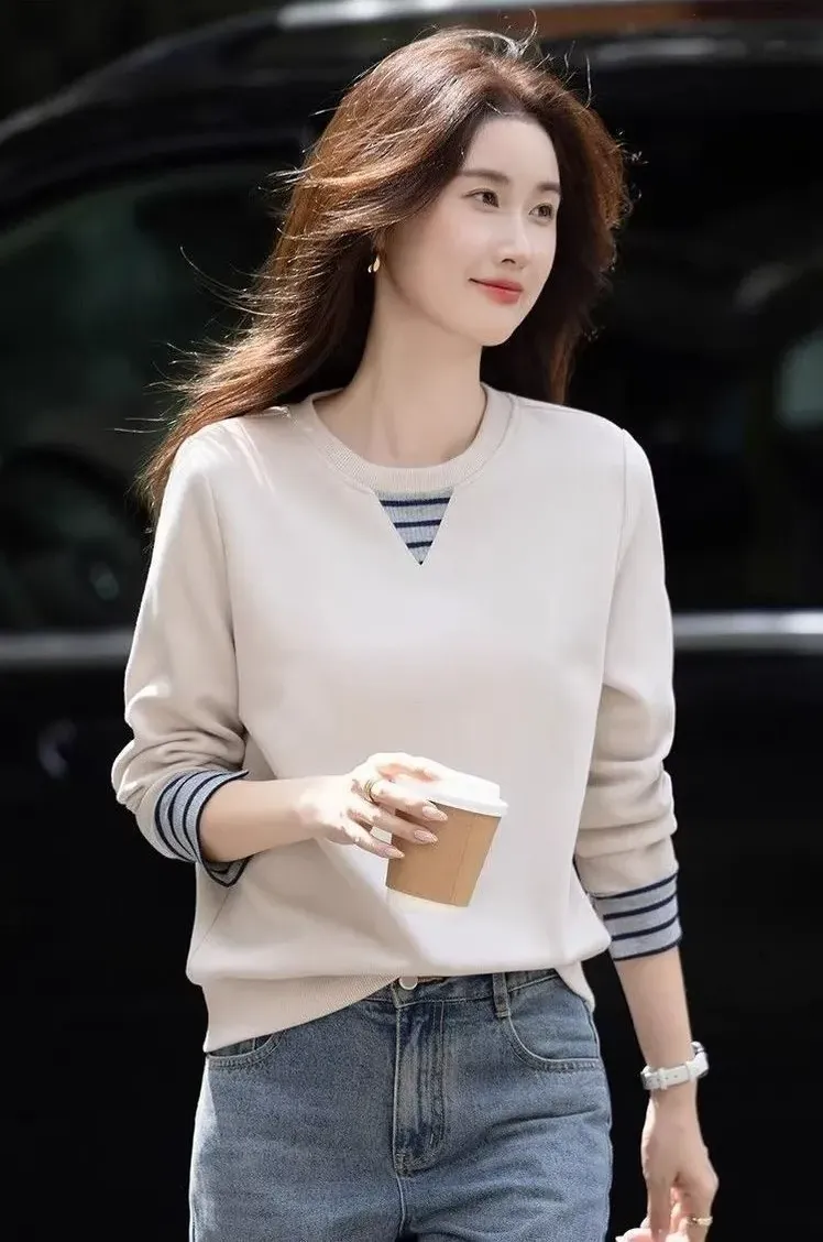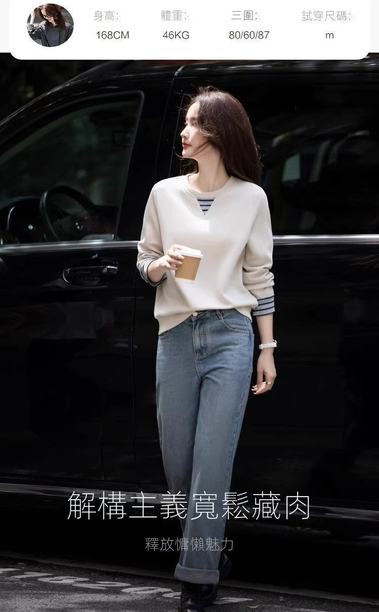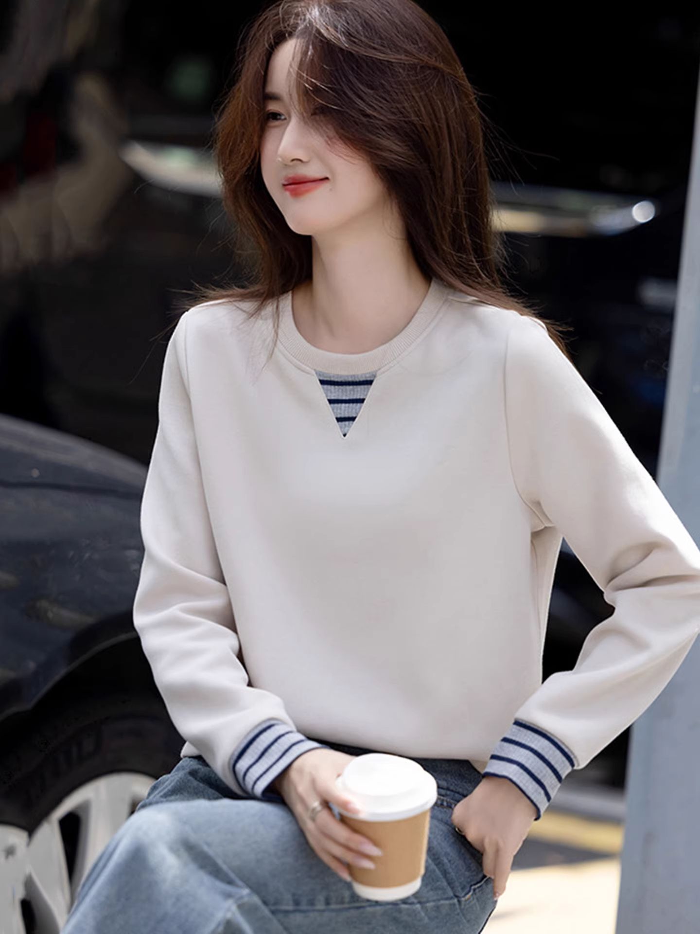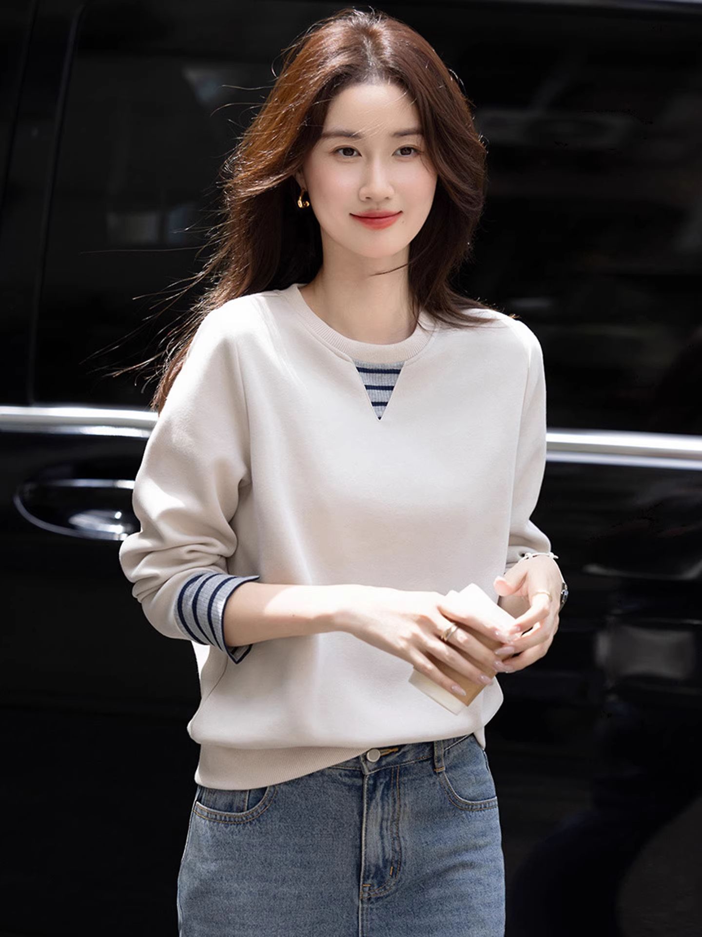 慵懶風寬鬆藏肉舒適時髦撞色袖口長袖T恤