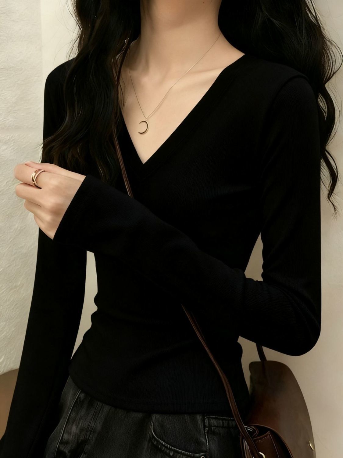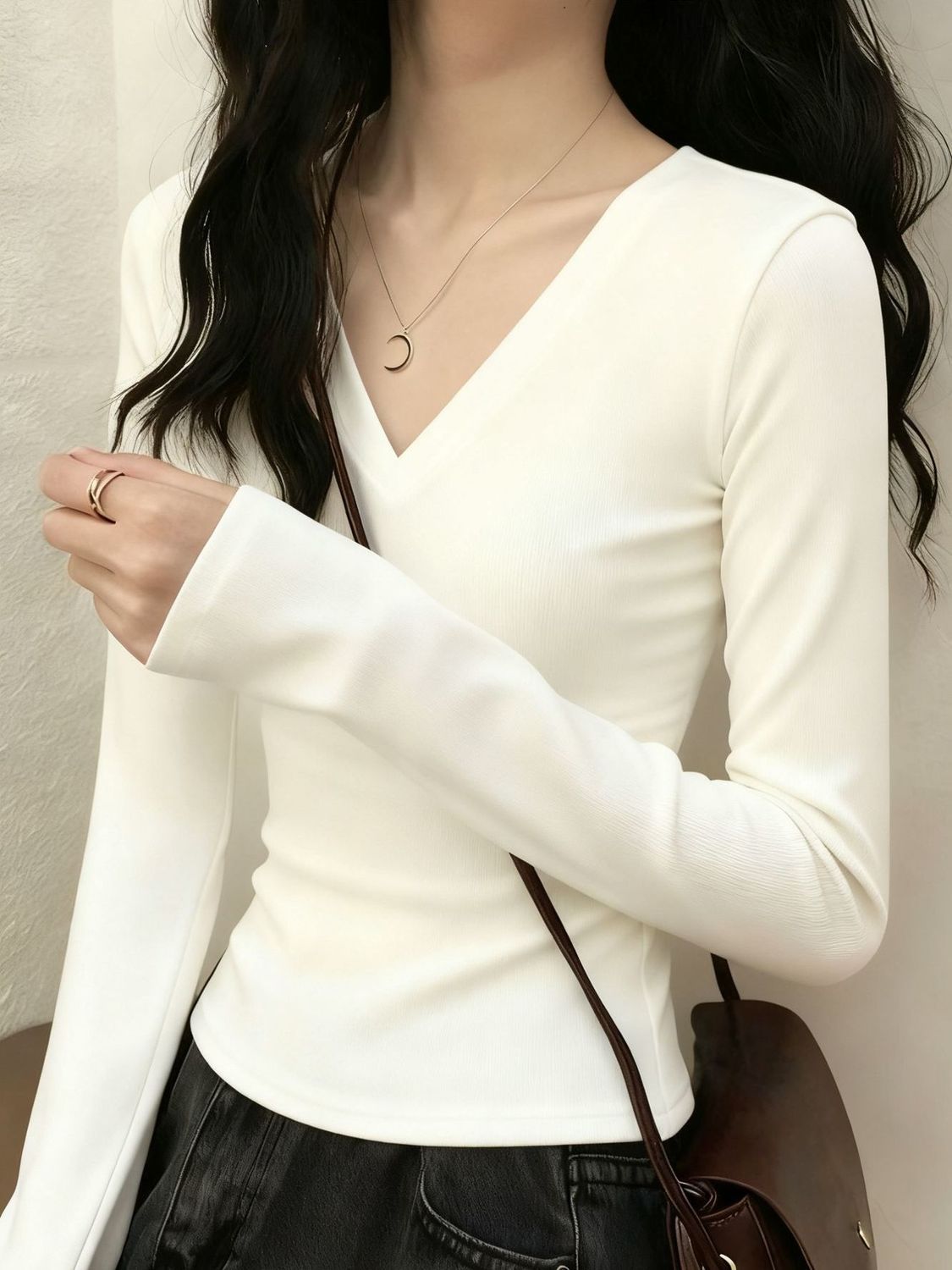 德絨V領正肩顯瘦打底收腰修身長袖T恤