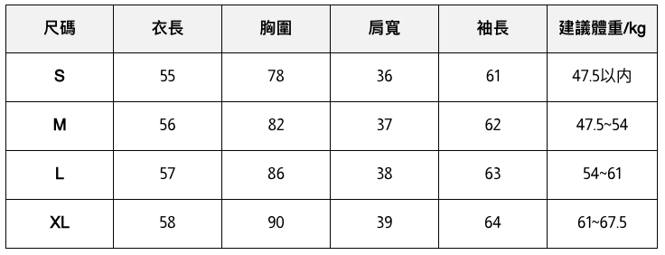 此處給出的參考尺寸表只是一個標準指南